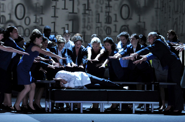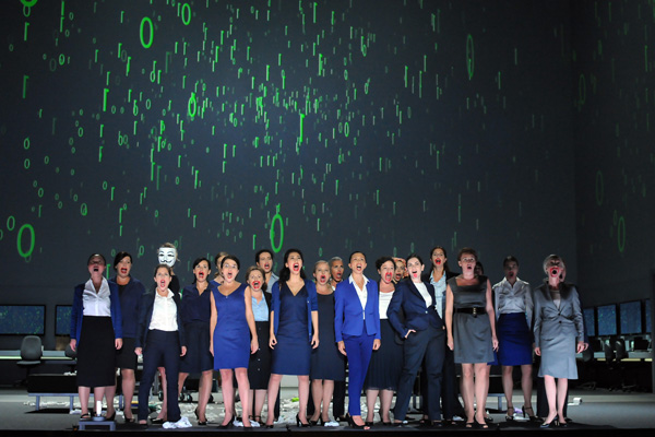 «Я убеждён, что Верди, пиши он эту оперу сегодня, перенёс бы её действие в мир финансов, единственной целью которого является увеличение прибылей», - утверждает знаменитый бельгийский режиссёр. Ладно, смотрим. На сцену, представляющую собой огромный офис (сценограф – Ян Ферсвейфельд), бодрым шагом выходят ведьмы, которых в современном финансовом мире олицетворяют бизнес-консультанты и специалисты по пиару (профессиональная принадлежность этих дам, одетых в деловые костюмы, также была указана в программке). Они рассаживаются по офисным креслам (приобретённым не иначе как в «Икее») перед огромными мониторами, раскрывают свои ноутбуки и, уткнувшись в них, поют о том, как они будут топить корабль какого-то несчастного моряка. И тут появляется Она – главная героиня.