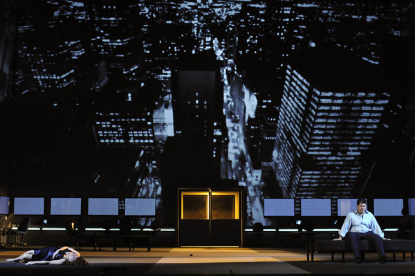 Когда занавес поднимается, мы оказываемся не в Шотландии XI века (что было бы неожиданно), а на 50-м этаже небоскрёба в деловом центре современного мегаполиса. Откуда я знаю, что на 50-м, а не, скажем, 51-м или 49-м? Из программки, где постановщик (Иво ван Хове), - не надеясь, видимо, на понимание публики, - сам подробно растолковал свой замысел.