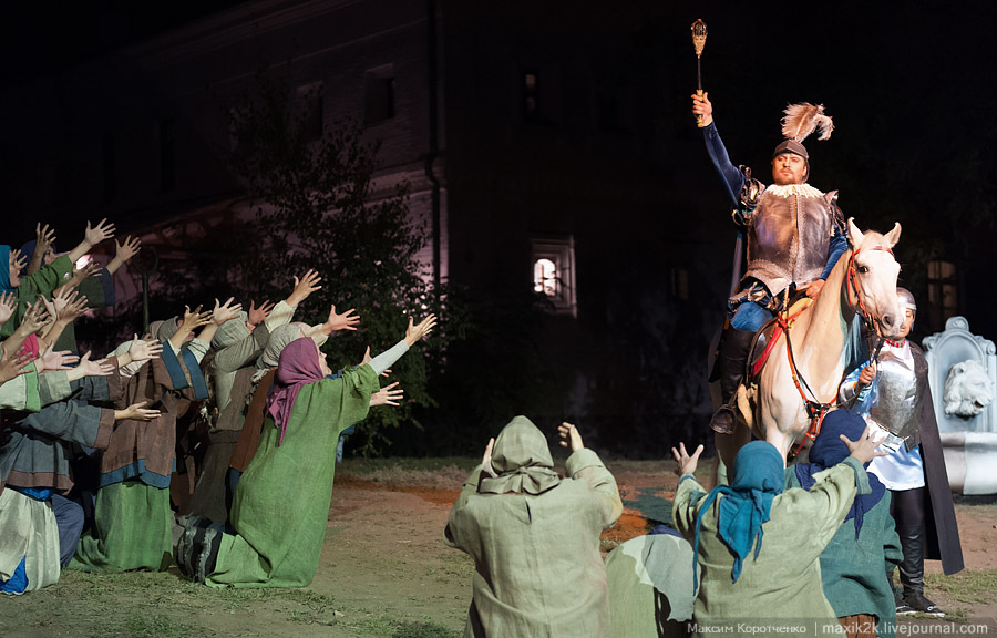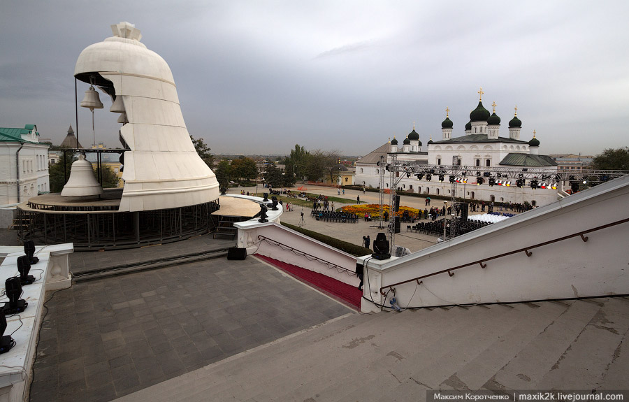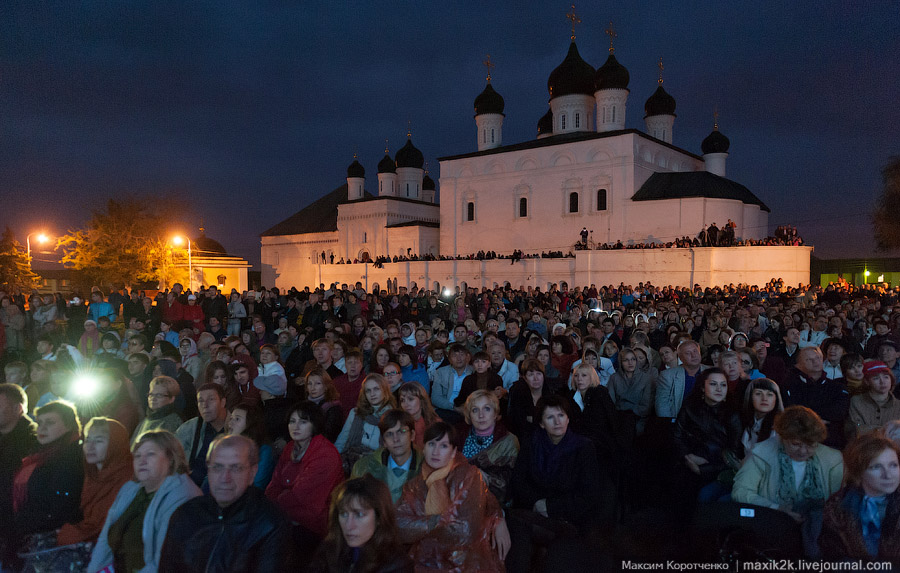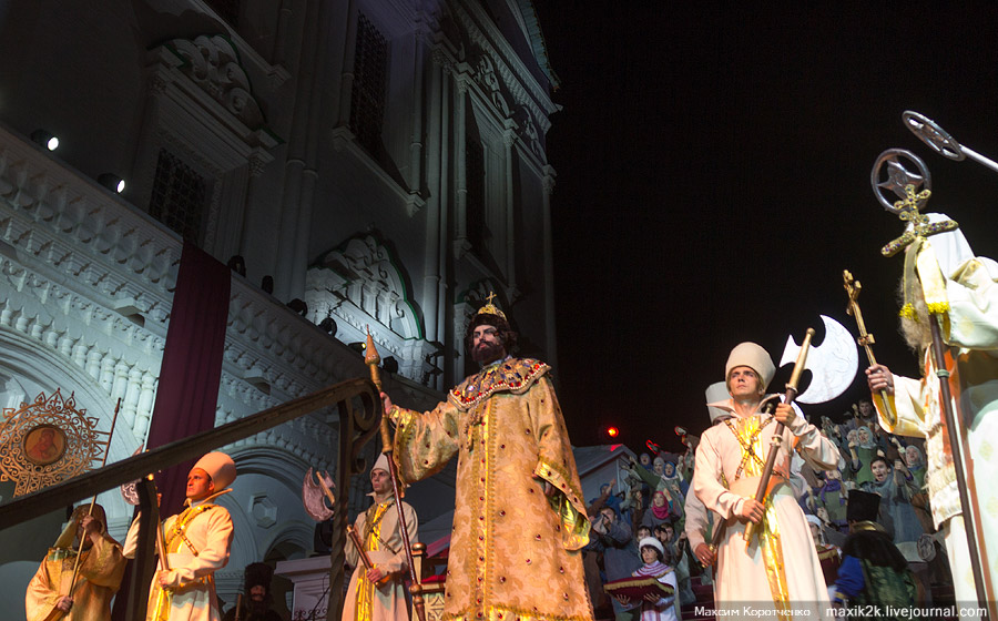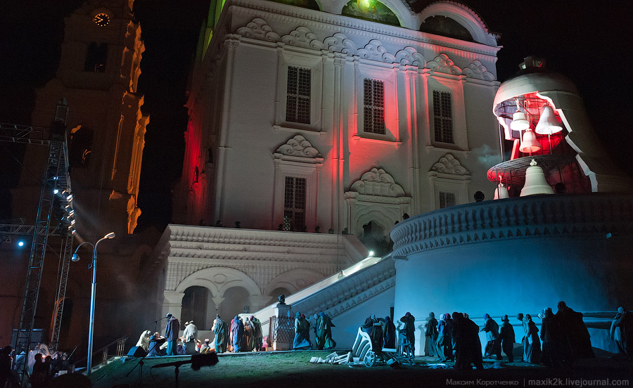Выбор этого пространства совершенно естественен ещё и по другой причине: ансамбль Астраханского Кремля, по крайней мере, главный храм Соборной площади – Успенский – с его мощными галереями, огромной лестницей и примыкающим величественным Лобным местом (вместе с московским на Красной площади их сохранилось в России всего два) создают небывало компактную композицию, где расстояния сравнительно не велики, и его действительно можно использовать как более чем удачную сценическую площадку для развёртывания полномасштабного исторического действа.