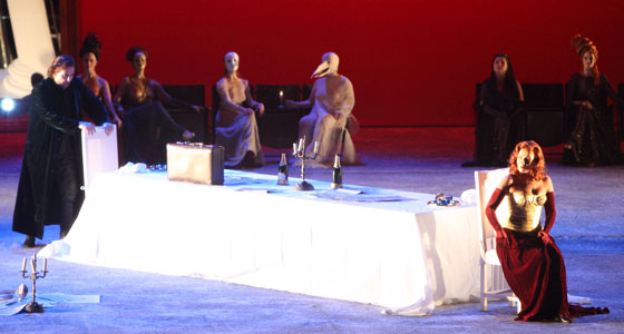 Главный герой в, разумеется, черном, разумеется, пальто мечется по сцене с чемоданом под звуки увертюры, свита Венеры его всячески не отпускает, сама Венера скандалит и соблазняет одновременно, коллеги по цеху психуют, та, кто любит, ему не сильно нужна, да тут ещё и папа римский словно с цепи сорвался, - словом, настоящий дурдом. Ну как тут не деградировать? На фоне ветшающего от действия к действию однотипного декора события развиваются, вернее, обозначаются настолько предсказуемо, что лишь качественное исполнение могло бы вдохнуть в эту безжизненную инсталляцию хоть какое-то содержание. И вот тут-то слушателей (как, впрочем, и зрителей) настигает серьёзное разочарование.