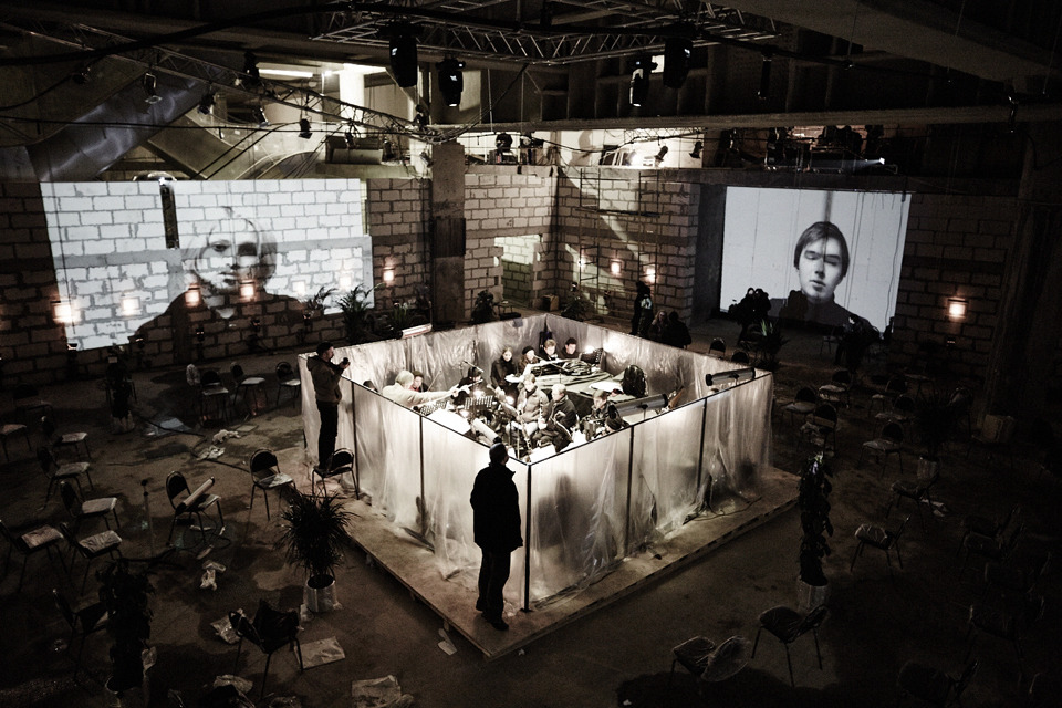Оформили это с позволения сказать арт-пространство предельно минималистски: белые листки с каракулями в рамках по стенкам (между ними на том монотонном звуке, что заменяет в опере увертюру, а потом повторяется еще раз ближе к концу, бегает оператор с камерой, выводящий картинку в проектор по четырем стенам). В середине зала — закрытый непрозрачным полиэтиленом куб, в котором смутно угадываются силуэты музыкантов, вокруг него сидят зрители (в пальто и шапках, потому что иначе там находиться невозможно), среди них рассредоточены чтецы, потом туда в середине оперы приходит постоять массовка (и так ничего и не сделав, уходит). Звуковая аппаратура, свет, титры. Это, собственно, все. Нет не только «действия», нет и концертной визуальной составляющей, не говоря уже про принятый в вокальном искусстве контакт певца с залом. Любительский видеоклип в натуральную величину с вашим непосредственным участием. Целевая аудитория — лица с мазохическим компонентом личности.
