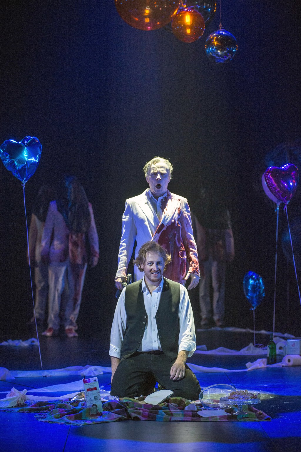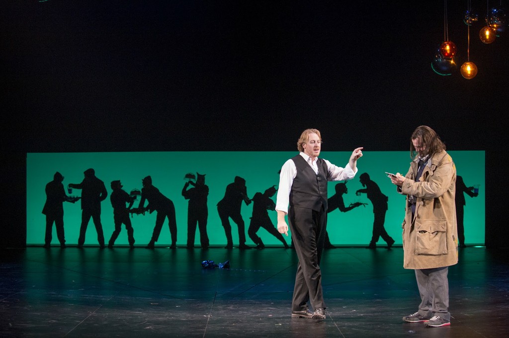 В какой мере дизайн сцены внешне напомнил мне одну из самых больших удач Английской Национальной оперы – всемирно известную поставку «Мадам Баттерфляй». Тут и там есть широкоформатный экран (но только сегодня не алого, а серого цвета). На его фоне появляется дьявольская команда масках и в хеллоуинских костюмах (а там – сама Баттерфляй и другие герои оперы в красочных одеяниях, а также слуги в безликих, черных, с головой, одеяниях, где только глаза видны). Там, впрочем, эти незаметные слуги изящно раздвигали тонкие раздвижные стены воображаемого японского дома, а здесь искусители с грохотом гоняли по сцене под разными углами серебряный многоугольник, во время движения которого на сцене заменялись декорации. В основном это сводилось к тому, что после очередной «пробежки» многоугольника на сцене оставались разноцветные воздушные сердца. Это что касается сценографии (Иан МакНил).