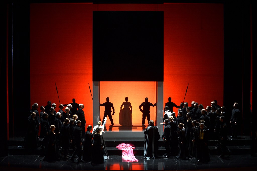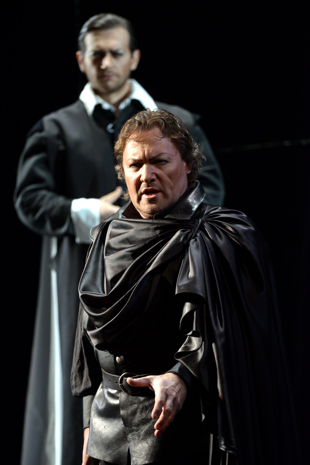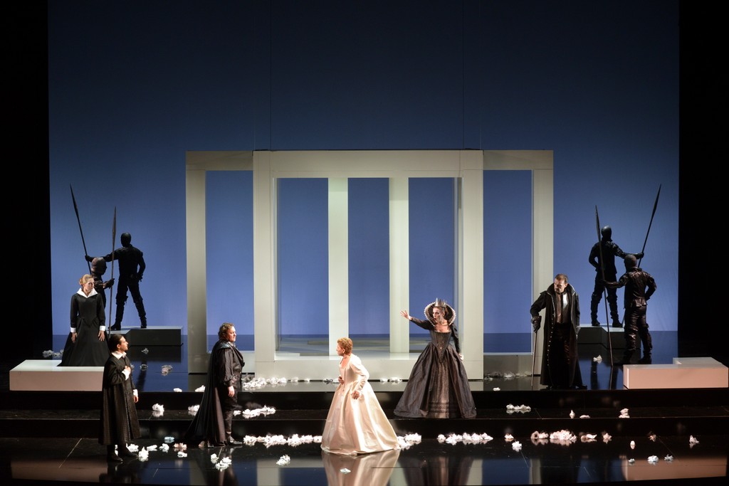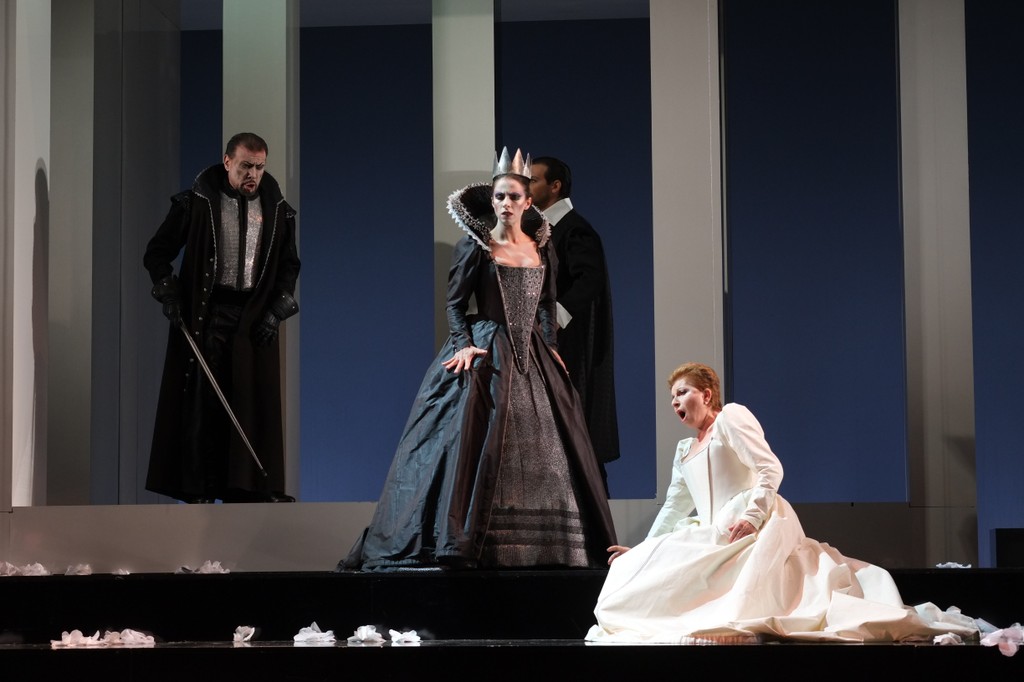 Девиа предстала в крайне достойной «оправе», начиная с Хосе Марии Ло Монако в партии Елизаветы. Ее голос не слишком красив, но тепло и темновато окрашен, узнаваем. Его недостатки – терпкость, оборачивающаяся жесткостью, и несвободный верхний регистр. Ло Монако хороша и как актриса, ее Елизавета – гораздо моложе Марии, не слишком уверенная в себе, создала отличный контраст шотландской королеве в интерпретации Девиа.