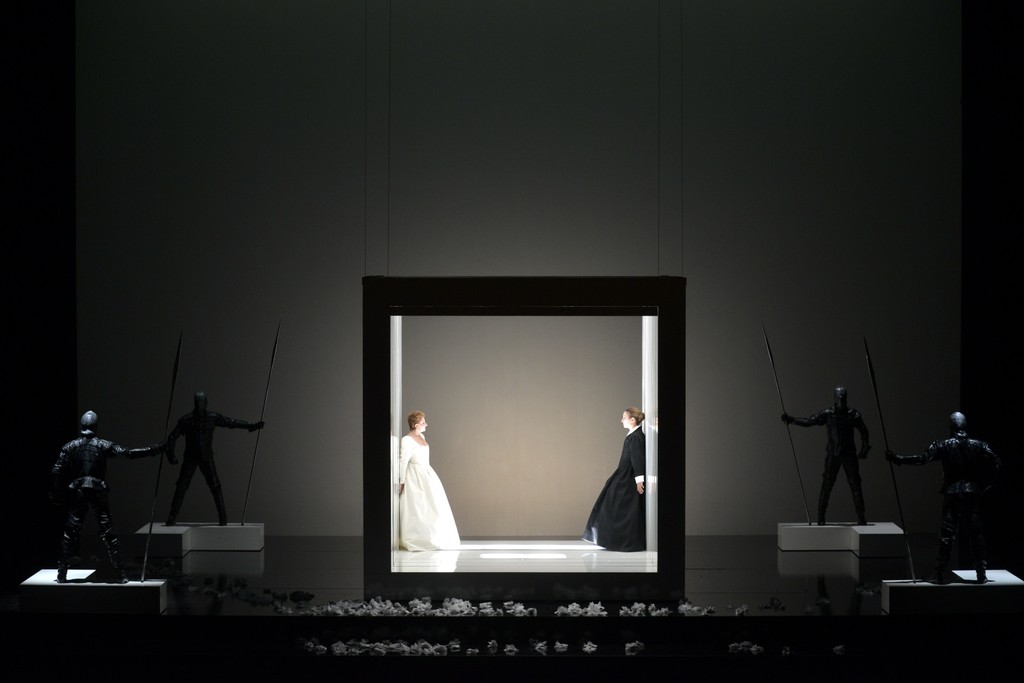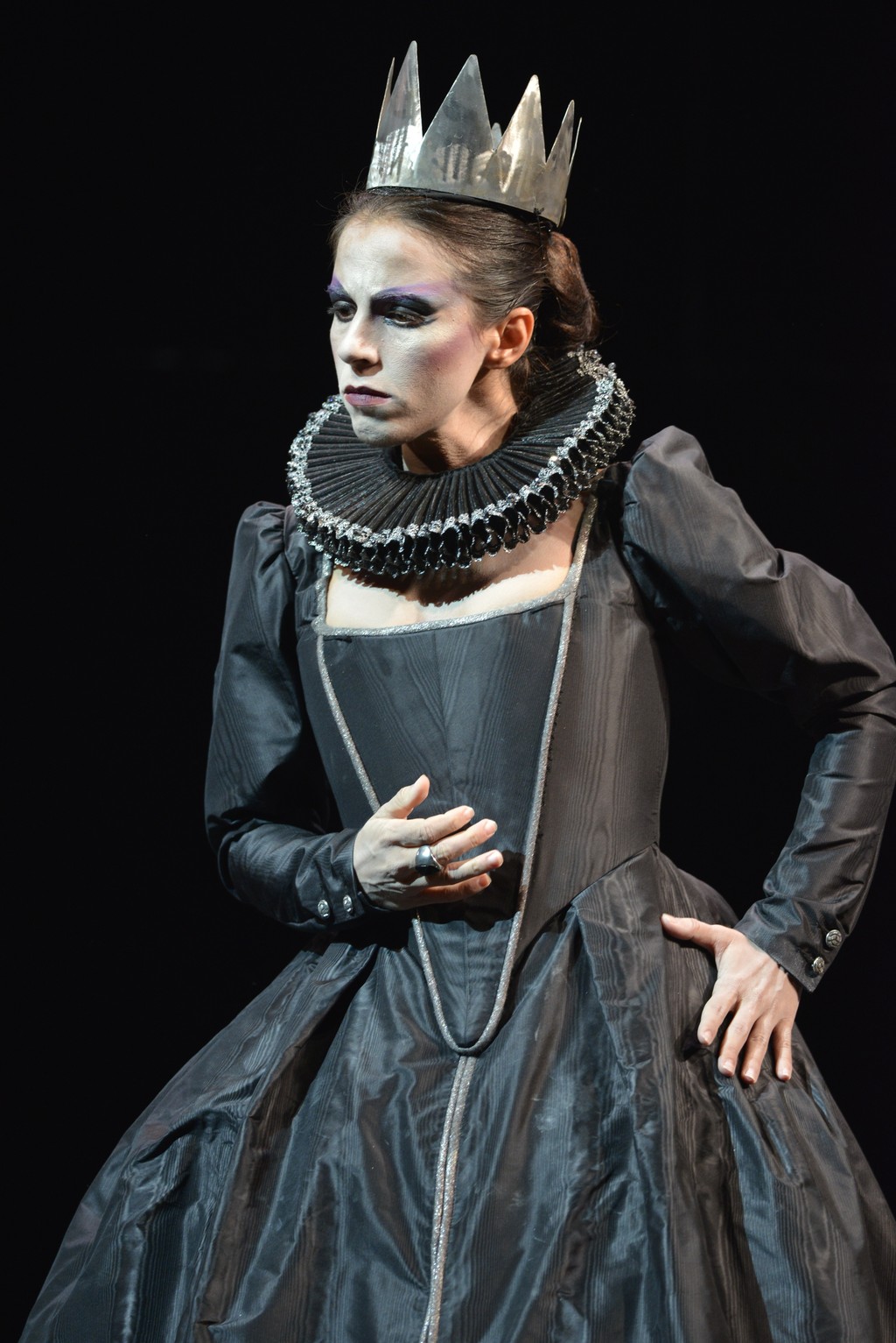 А что же спектакль (режиссер Федерико Бертолани, сценография Джулио Маньетто, художник по костюмам Мануэль Педретти, по свету Клаудио Шмид)? Как справедливо выразился один итальянский коллега, «не беспокоит». Черный пол. Некая кубическая структура посреди сцены – фантазия дорисует замок, где томися царственная пленница, или зал, где она взойдет на плаху. Сверху структуры – трон Елизаветы. Простота, гармония, любовь в геометрии, два цвета, белый и черный. Минимальная и разумная оправа для бельканто, «прекрасного пения».
