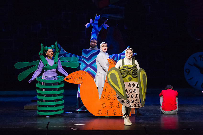Единственная ария, изредка мелькающая в концертах, принадлежит Огню, или Светильнику, как обозначено в программке. Вернее — это газовая плита, судя по раструбам с голубыми «горелками», надетыми на кисти рук артистки. Россыпь колоратурных пассажей певице Ольге Ионовой далась с трудом, чуть с помарочками. Но более мягкий, хоть и тоже с высокими нотами мелодический рисунок Принцессы из сказки прекрасно передавал образ, без намёка на вокальные сложности. Соловей в её же исполнении просто мило прощебетал.