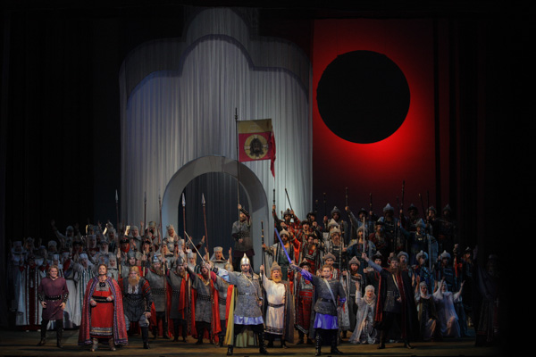 Таким образом, авторская последовательность развития действия в целом была сохранена, что в постсоветской сценической практике наблюдается далеко не всегда. Только вместо точки, пускай и промежуточной в исторической перспективе, получилось многоточие… Подобное усечение (с некоторыми вариациями) – тоже не новость в современной практике. Если его не превращать в дурно «пахнущий» памфлет, то отторжения оно не вызывает. В данном случае это многоточие было вполне «вменяемым», окрашенным в проникновенные тона (один замечательный по красоте Хор поселян чего стоит), и не шло в разрез ни с историческим моментом, отраженным в либретто, ни с художественной сутью неоконченной оперы Бородина, в которой неизбывно присутствует элемент авторской финальной недоговоренности. Глубинные причины такой недоговоренности настолько интересно сформулированы известным музыковедом и культурологом Т.Чередниченко, занимавшейся реконструкцией «Князя Игоря», что позволю себе пространно процитировать ее мысли: