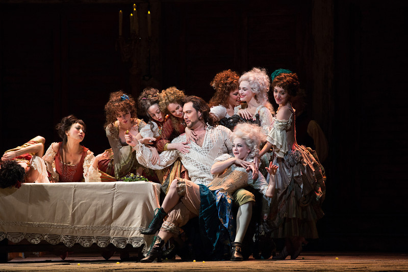 Ильдар Абдразаков в партии Дон Жуана прекрасно звучит в «Là ci darem la mano», чётко и стремительно (наперегонки с оркестром, хоть и без огонька) исполняет «Finch' han dal vino», но в первом акте понять, что движет его симпатичным, но несколько неуклюжим героем, сложно. И вот звучит серенада «Deh! vieni alla finestra» - на мягких пиано с шелковыми переходами, несмотря на запутавшуюся в аккордах мандалину, образ начинает проясняться, а в сцене блестящего пародирования пластики своего слуги Лепорелло, которого блестяще сыграл и исполнил Эрвин Шротт, получает чёткую завершенность. Дон Жуан у Абдразакова – актёр. Актёр, наслаждающийся процессом, но ничего не чувствующий в процессе. Это не система Станиславского, а спорт, в котором участник испытывает азарт не чувственный, а… технологический, и это решение показалось мне свежим. Этот Дон Жуан будто испытывает разные приёмы и радуется их удачному применению.