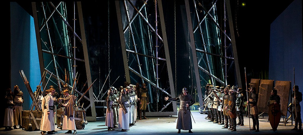 Тот же принцип исповедует и режиссура, призванная не мешать певцам делать свое дело, структурно упорядочивая ритмопластический рисунок мизансцен и ролей, следуя музыкальной образности, и лишь обозначая конкретные поступки и чувства героев… Ей вторит и световая партитура спектакля (Вирджинио Леврио). Связующую роль между современной пластикой сценографии и исторической канвой выполняют костюмы (Симона Моррези) с их продуманной цветовой гаммой.