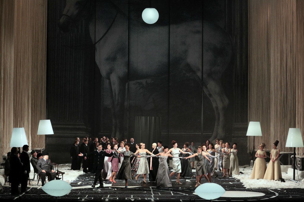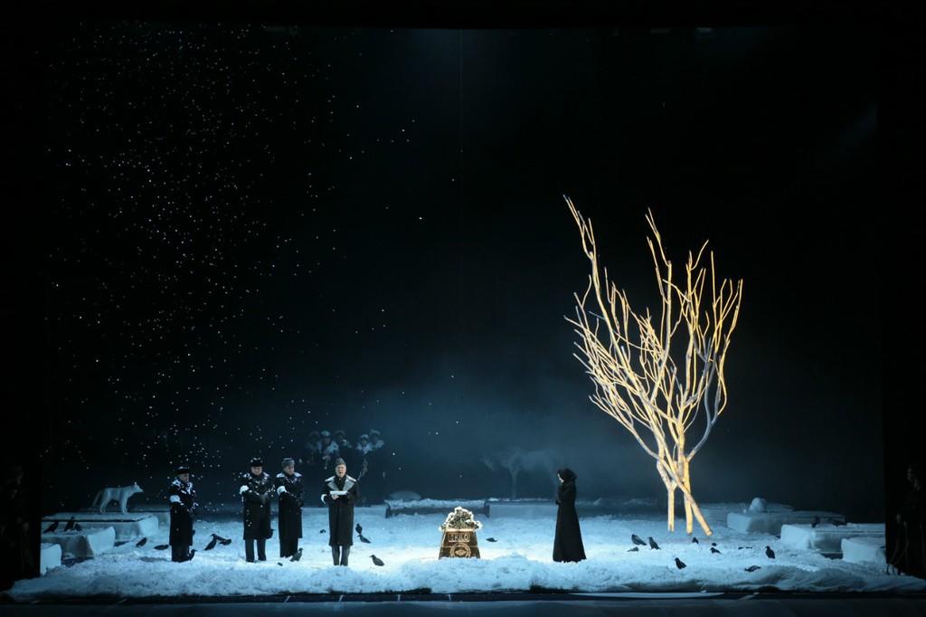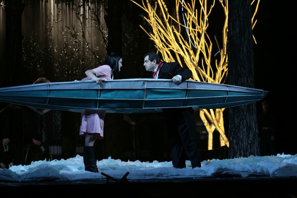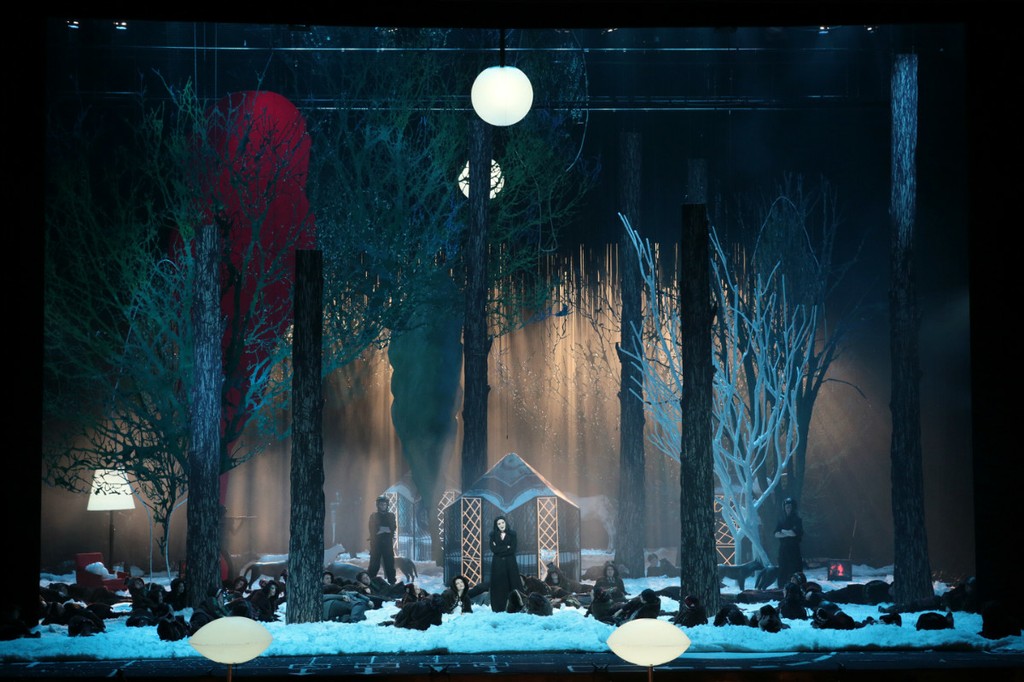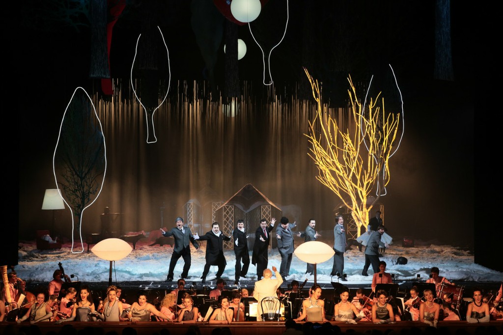 Постановщики продемонстрировали нам еще множество придумок как зрелищного так и разговорного плана. Весьма разнообразными были причуды разбогатевшей Ганны, таким образом, видимо, подвергающей испытаниям своих многочисленных поклонников. Так, при первом выходе на сцену героиня предстает перед публикой стриженой абсолютно наголо, передав нам своеобразный привет от «лысой певицы» Ионеско. Праздник в доме вдовы во 2-м акте, как и предписано оригинальным либретто, носил национальный «расписной» характер. Но «палех» этот оказался с сюрпризом: на сцене, заваленной снегом (опять снег!), мы видим… ярангу и ряженых чукчей! Какой только абсурд не взбредет в голову «взбесившейся вдове» – именно так ее величает барон Зета! А яранга весьма сгодилась под павильон, в котором уединяются влюбленные Валентина и Камилл.