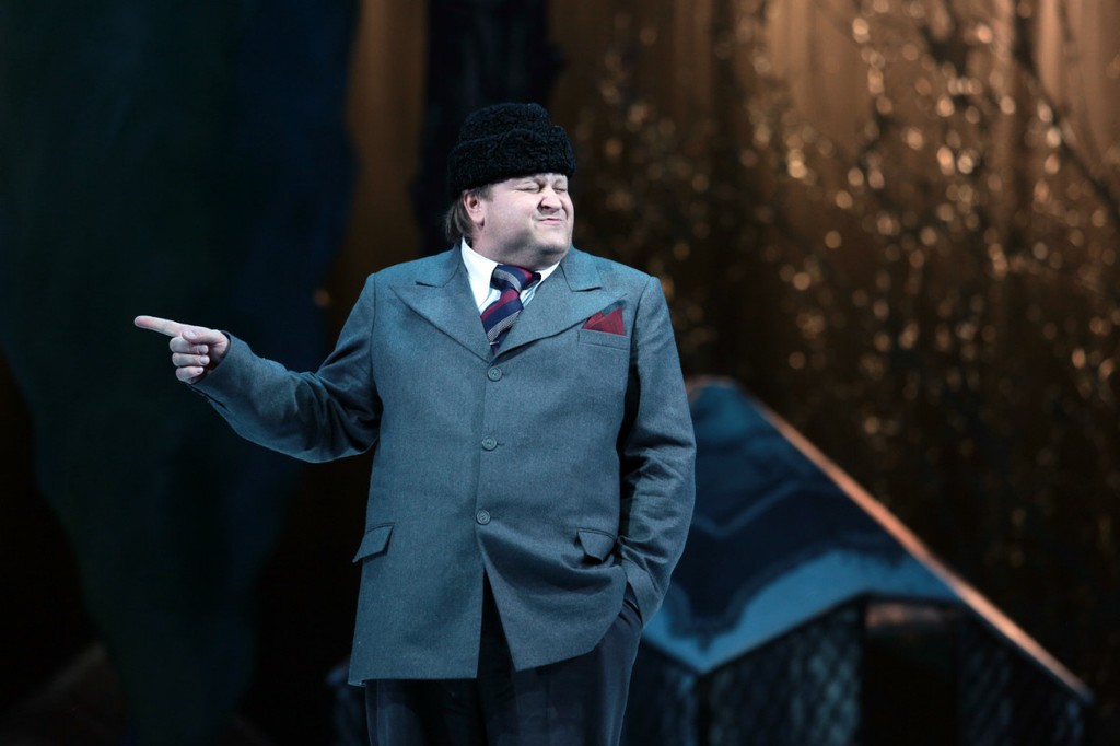Удивление не заставило себя ждать уже при входе в зрительный зал. Сцена вместе с оркестровой ямой были отгорожены публики… занавеской весьма доморощенного вида. Далее по нарастающей – занавеску отдернули, и пред нами предстало… кладбище и мрачная в черных тонах сцена похорон. Зима, падающий снег – и на этом фоне гроб из слитка золота. В течение нескольких минут в полной тишине отнюдь не веселая вдова принимает соболезнования сильных мира сего, приближенных к «телу» банкира Главари («говорящая» фамилия, однако). Затем гроб медленно погружается в пучину земную под звуки «траурного» марша-парафраза на тему шансонетки гризеток, исполняемого сценической бандой…