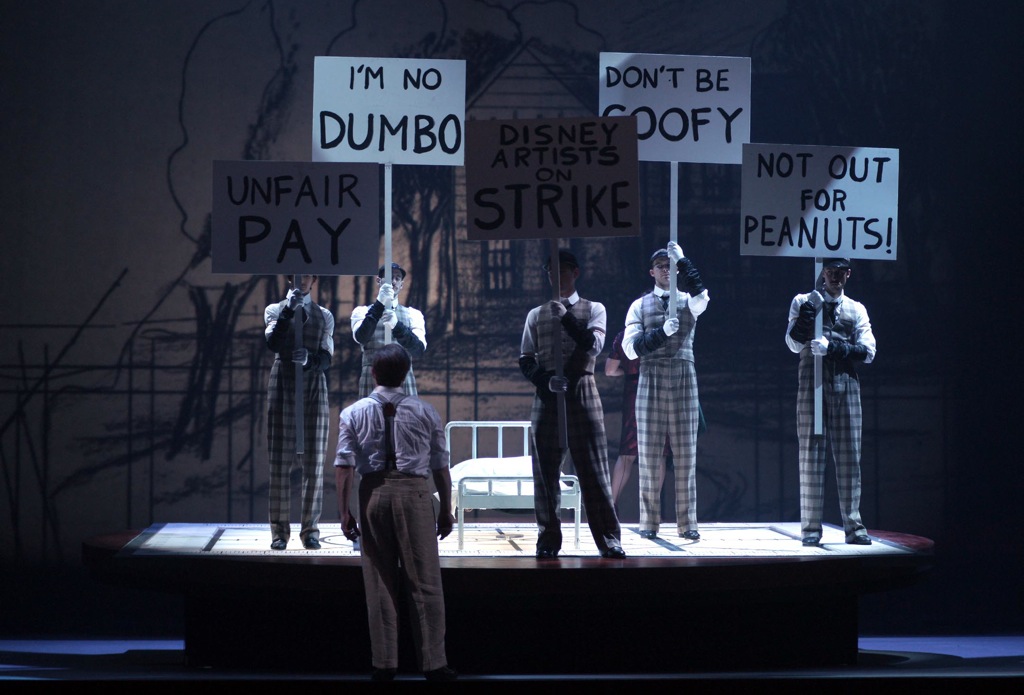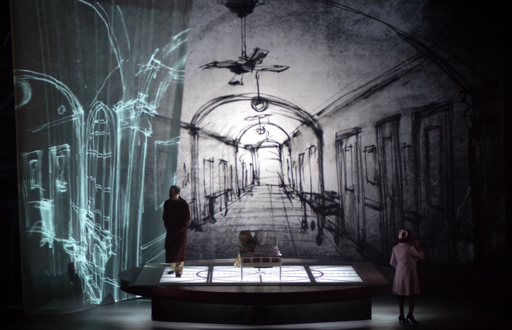 Постановка Фелима Мак-Дермота необыкновенно традиционна. Для театра Мортье, известного сторонника вспарывания и препарирования классических сюжетов, это кажется странным, но, впрочем, лично автора этих строк не удивляет нисколько: неоднократно сталкивался с тем, что пыл режиссёрского экспериментаторства улетучивается при столкновении с современными партитурами. Казалось бы, чем переиначивать то, что было написано задолго до нас и не требует по большому счёту никаких иносказаний, берите свежий материал и экспериментируйте, самовыражайтесь. Но нет: перед нами Америка 30—60-х годов прошлого века, павильон киностудии с прожекторами, камерами и экранами, на героях – одежда (художник по костюмам – Дан Потра) времён президентов Рузвельта и Джонсона… Ничего не имею против иллюстративных постановок, скорее напротив – обеими руками за. Однако непоследовательность «модернизаторов» оперного искусства смущает: паразитировать, видимо, можно только на классике, современная же опера требует тщательного разжёвывания сюжета – не дай бог зрители чего-либо не поймут… Если же оставить иронию, то стоит отметить вкус, с которым организовано сценическое пространство, функциональность и немногословность сценографии (также работа Мак-Дермота), в основе которой – четырёхугольный подиум с больничной кроватью на нём, видеопроекции, графически рисующие то госпитальные коридоры, то анфилады комнат в доме Диснея, и, конечно же, студию с прыгающими по экранам мультипликационными фигурками.