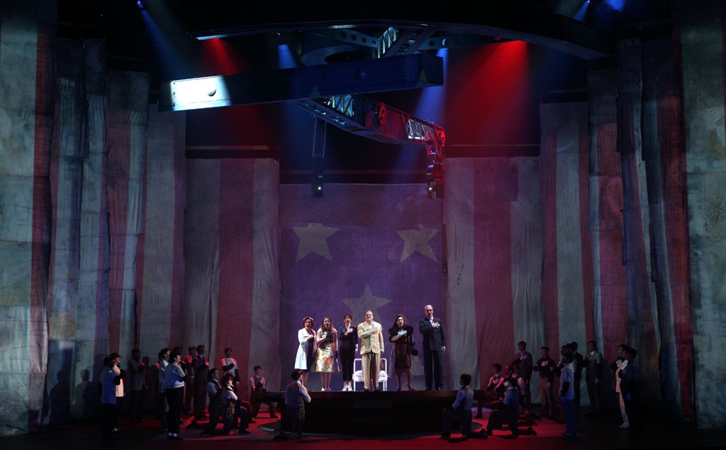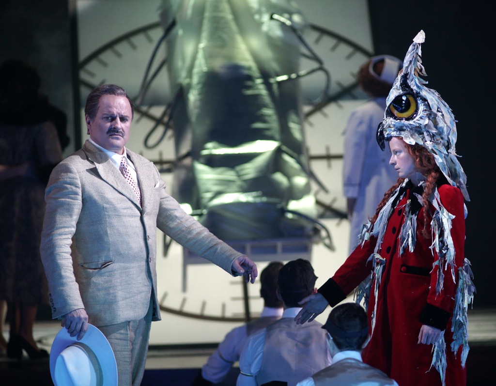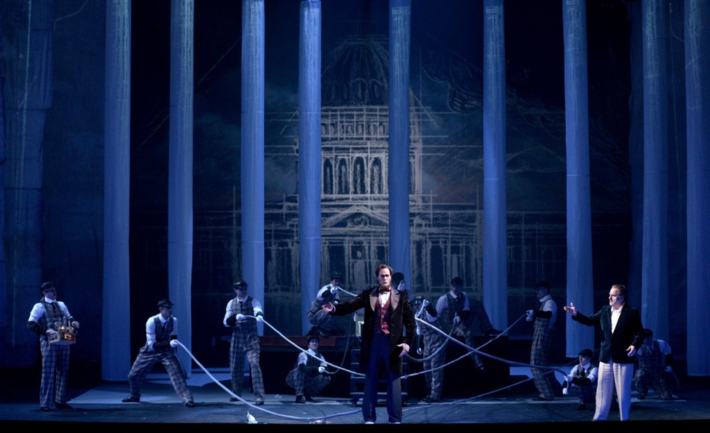 Маэстро Деннис Рассел Дэйвис превосходно управляется с кинематографически стремительно сменяющимися картинами: в его интерпретации партитура приобретает необходимую упругость звука и ритма, динамизм неумолимо несущегося поезда – именно эта ассоциация возникает не раз по ходу действия. Оркестр театра играет точно и без помарок, хор-комментатор, подобно античному хоросу, часто заключающий те или иные картины, дополняет картину музыкального благополучия премьеры.