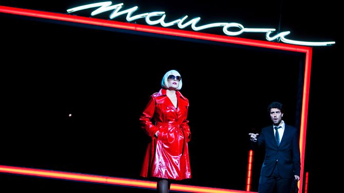 В сверхсовременном оформлении сцены, кстати, технически выполненном безупречно и ни разу не давшем сбоя, немаловажная роль отводится заднику, занятому экранами. На них проецируются то рекламные картинки туши и помады, видимо, рисующими мир соблазнов для Манон, то хаотичные огни и трафик крупного города. Это – внутренний мир Манон, её мечты о Париже и о роскошной жизни. Вот это визуальное удешевление ментальности Манон, как персонажа, будто бы осовремененного режиссером, тоже настораживает: да неужели же девушку двадцать первого века можно соблазнить помадой, пеньюаром и пенной ванной, как это показывают нам позже и как заранее изображают сладкую жизнь дигитальные экраны сцены? Ведь Манон в трактовке Трелински ничуть не похожа на бедную девушку, которую родители отправляют в монастырь, заметив её тягу к удовольствиям: она появляется на сцене в ярко-алом плаще, темных очках и поражает Де Грие нарочито аффектированной жестикуляцией курильщицы. Она уже изрядно подпорчена, прямолинейно говорит нам режиссёр, используя для навязывания этого впечатления опять же клише «плохой девочки» в стиле шестидесятых годов прошлого века. Манон ищет для себя красивую раму, и рама тут же выплывает на сцену: алая, cветящаяся, с надписью Manon. В неё-то она аккуратно и помещается, словно в кадр трафаретной соблазнительной дешёвой рекламы.