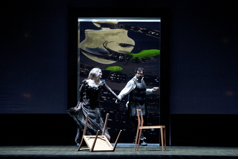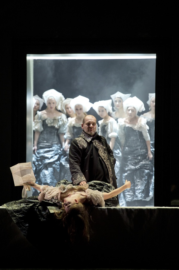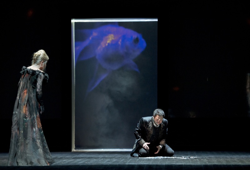 Драматический режиссер Винсент Буссар, обожающий костюмные постановки в стиле эпохи написания произведения (не важно, драмы или оперы), вместе с дебютантом в «Ан-дер-Вин» французским кутюрье Кристианом Лакруа тоже не обошелся без фауны, но их фантазиями овладели золотые рыбки, а именно рыбы из сонника Фрейда, символизирующие, как известно, не очень приличные вещи. Предполагается, что зрители-венцы, знающие книги Фрейда примерно как мы – произведения Пушкина, в курсе, о чем речь. Тиридата замучили «ночные рыбы» - они же фаллические символы. Красавицы девы – рабыни тирана, одетые Лакруа как модели фламандских живописцев, постоянно снуют по сцене, держа в руках шарообразные аквариумы для золотых рыбок. К их интимным услугам регулярно прибегает «озабоченный» Тиридат (помимо разборок а ля Фрейд, рыба является одним из символов богини Иштар – аккадской Венеры, о чем стыдливо поведал Лакруа читателям премьерного буклета), но поскольку ему нужна лишь одна единственная женщина – недотрога Зенобия, присутствие пышнотелых и доступных «фламандок» в итоге только усиливает его узкоколейную страсть.