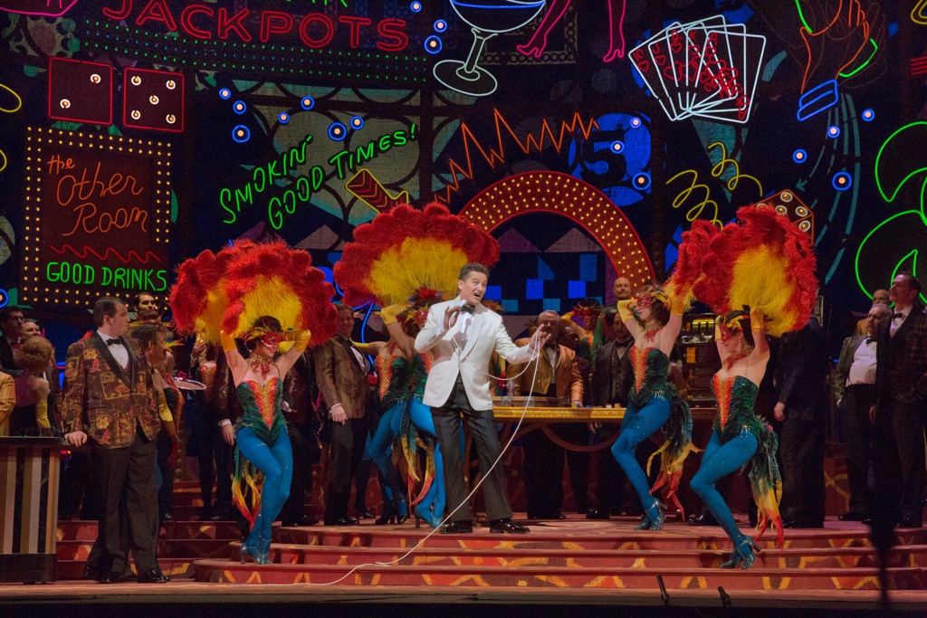 Герцог у Майера становится Фрэнком Синатрой, действие переносится в Лас-Вегас начала 60-х годов прошлого века, граф Монтероне оборачивается султаном, которого застреливают из пистолета прямо в присутствии всей честной тусовки, включая Риголетто и уже обесчещенную Герцогом Джильду. То есть логически и социально-политически почти всё стройно: Риголетто прячет свою дочь от развратного ужаса развратного города (количество полуголых моделей и стриптизёрш в спектакле – неимоверное), а сам зарабатывает на жизнь посредством… И тут логика предложенной режиссёром модернизации заканчивается. А что всё-таки делает в Лас-Вегасе Риголетто? Какова его социальная роль? Он же явно аутсайдер (проигравшийся завсегдатай казино?), но мы этого не знаем наверняка. Что связывает Риголетто с Герцогом, вообще не разобрать. Да и сам Герцог в роли эстрадного певца не выглядит тем человеком, которому могло бы слепо услужить столько народу, ибо – зачем бы оно им было нужно? Но, кроме этих формальных несуразностей, в постановке Майера есть и масса интересных находок. И вот эти находки тем более ценны, что до Майера, насколько мне известно, лишь единицы постановщиков справлялись с весьма заковыристой драматургией этой вердиевской оперы.