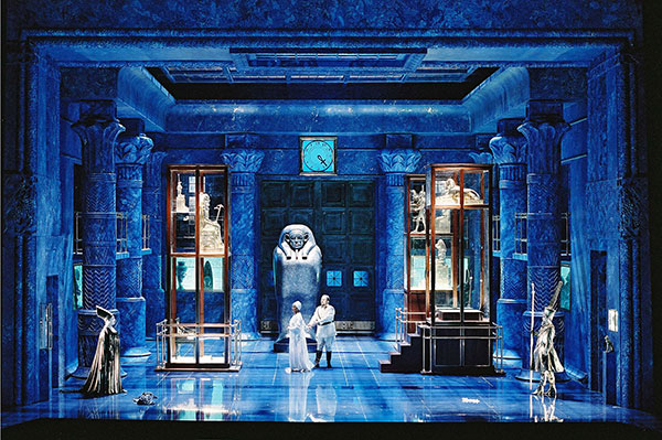 На достаточно узком пространстве сцены воплощается концепция Хальмена. Помимо "обычных" музейных экспонатов, в спектакле участвуют символы: часы, отсчитывающие время зеркально, два оживших Анубиса, сопровождающие Аиду, и огромный саркофаг с головой египетского бога Пта, стоящий в центре сцены. Саркофаг в финале оперы закрывает Аиду и Радамеса, Амнерис и ее отец, Царь Египта, занимают свои места в музейных витринах и застывают, появляется задумчивая фигура человека, "очень похожего" на Джузеппе Верди, с партитурой, и занавес опускается.