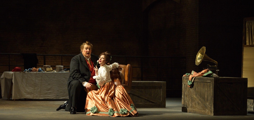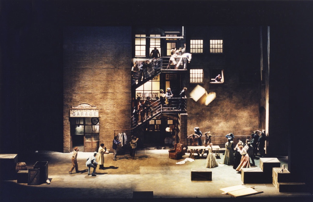 Как известно в этом крупнейшем в Европе театре, который построен в 1989 году с залом на 2 703 места, акустика устроена таким образом, что звук голосов идёт скорее вперёд, чем вверх. Тем более, что галёрка расположена гораздо выше, чем в старинных театрах. Александр Беляев выстроил декорацию в виде трёхэтажного дома с открывающимися окнами. Таким образом вокалисты поют с трёх уровней, что очень красиво заполняет пространство акустически по вертикали. Я полагаю, что галёрка была абсолютно счастлива. Кроме того, эта декорация дома во всю высоту и ширину сцены оставляет артистам очень много пространства для манёвра, и придвинута достаточно близко, выполняя роль щита – отражателя звука. Таким образом, вместо того, чтобы рассеиваться во всех направлениях, весь звук целиком направлялся прямо в зал, что очень ощутимо усиливало силу звучания голосов по сравнению с теми спектаклями, где половина звука улетает в противоположную сторону: вглубь сцены. Декорация не просто красива, но функциональна и очень помогает голосам.