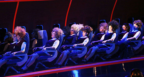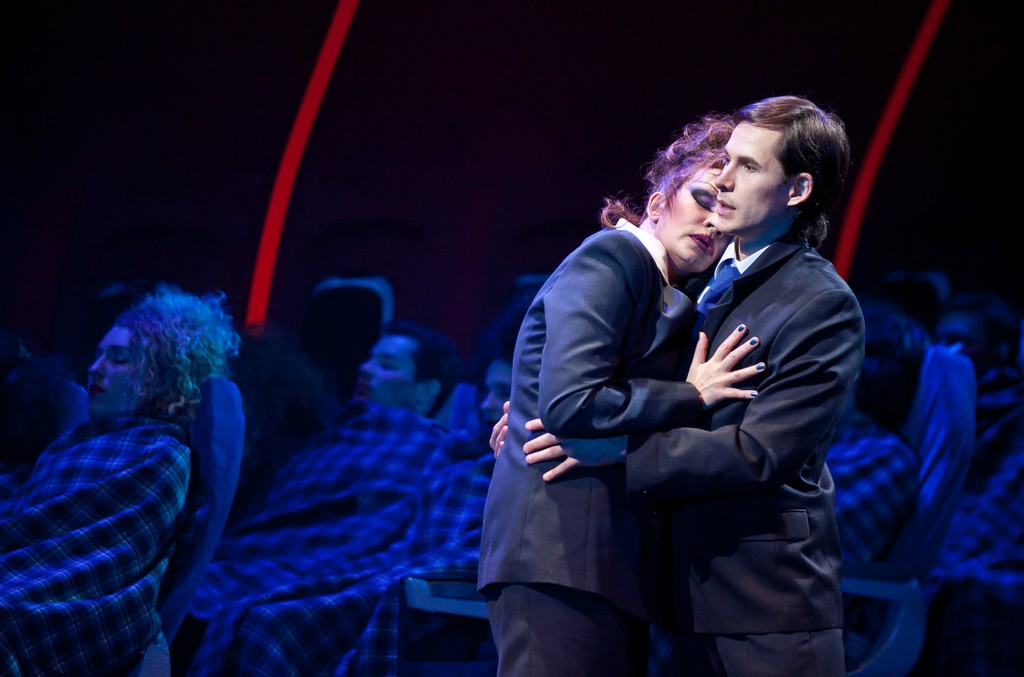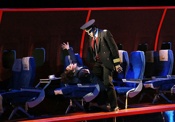 И вот увертюра завершена. На сцене мы видим всамделишный (авиакомпания-партнер помогла) салон самолета в разрезе с рядами кресел, иллюминаторами со шторками – все довольно натурально. Однако лайнер этот загадочный (чем не «Летучий голландец»?) – он совершает свой мистический полет из ниоткуда в никуда. На его борту – команда летчиков и стюардесс, которые, впрочем, при необходимости превращаются в пассажиров. Никого не смущает одинаковая лётная униформа – взаимозаменяемость полная.