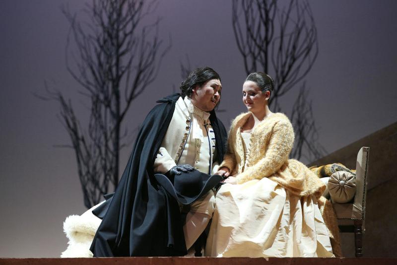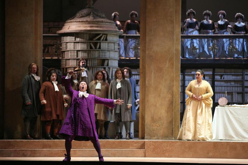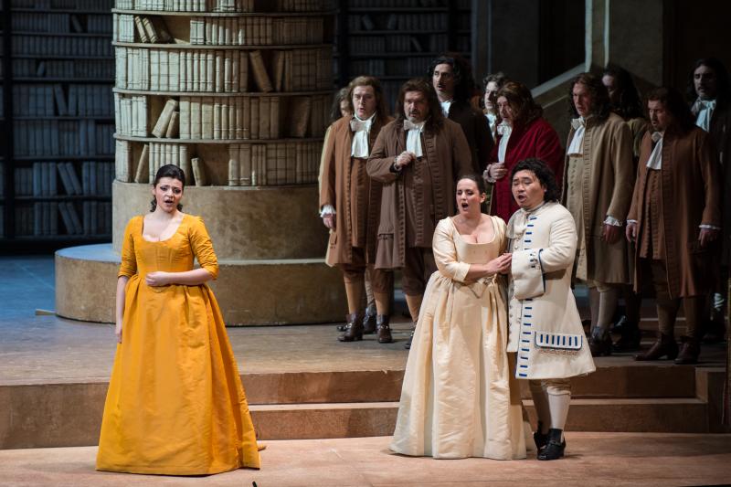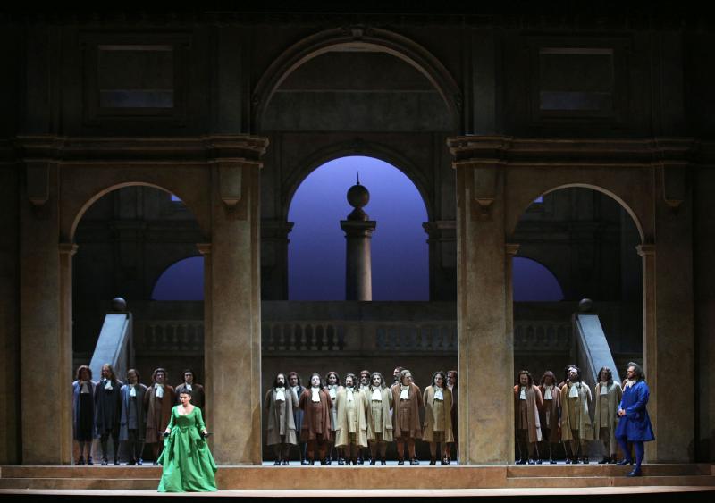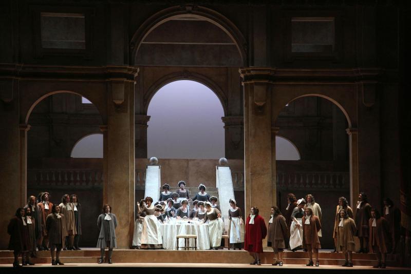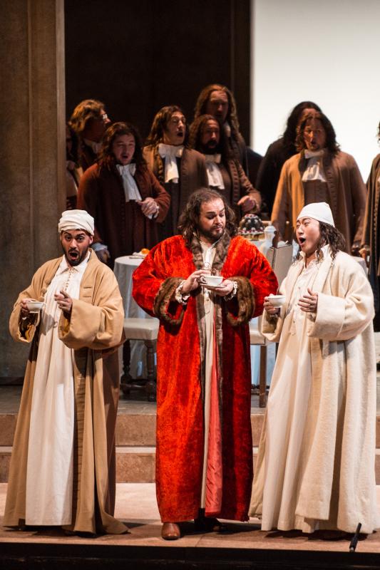 Сомненья нет, все это вещи многократно виданные, но в применении ко многим операм, особенно первой половины девятнадцатого века, хорошо функционирующие, и в особенности пленяющие глаз тонким вкусом и изяществом. «Пармский» дворец, в котором разворачивается веселая суматоха, - в светлых, «песочных» тонах; костюмы персонажей ярких, насыщенных оттенков: создающийся контраст очень красив.