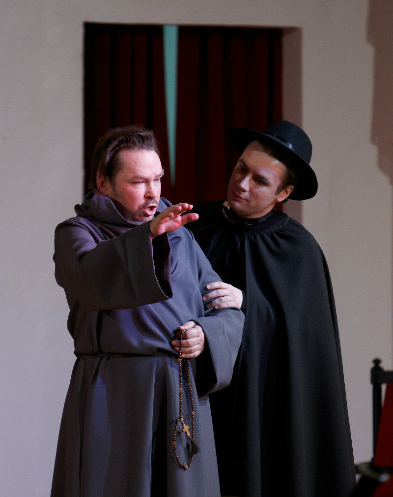 Сложность исполнения также заключалась и в выдвижении на господствующие позиции разных видов вокальной речитации, а также в отказе от традиционных оперных форм. Даргомыжский, однако, ввел в свою оперу две песни Лауры, но это стало в жанре исключением, лишь подтверждающим абсолютное господство монологов и отдельных ансамблей. С этой исключительной сложностью партий, требующих от исполнителей подключения актерских ресурсов, прекрасно справились участники сцен из «Каменного гостя»: Дмитрий Мазанский (Дон Гуан), Владислав Власов (Лепорелло), Дарья Кудрицкая, студентка 2-го курса (Донна Анна) и лауреат всероссийского конкурса Михаил Шичанин (Монах, Статуя Командора). Стало очевидным, что студенты прошли прекрасную подготовку на кафедре сольного пения ГСИИ, которой руководит Лада Атлантова.