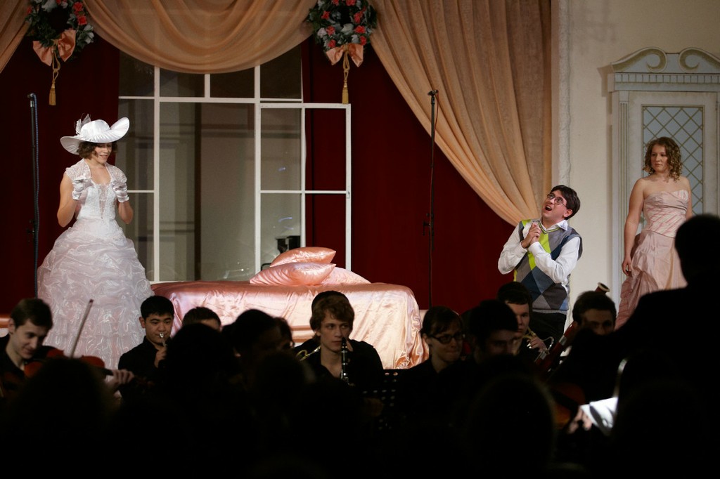 Представленный тем же постановочным коллективом второй спектакль настраивал зрителей на приподнятый, прямо новогодний лад. Искристая, остроумная музыка Ж. Оффенбаха, исключительно щедрая в своем блистательном мелодизме, вызывали восторг еще у современников композитора. Россини, например, назвал Жака Оффенбаха «Моцартом Елисейских полей» и был прав в своей оценке. «Муж за дверью» - типичная комедия положений, которая разыгрывается двумя парами. Это сочинение, хотя и не самое популярное у автора, создавшего «Прекрасную Елену», «Периколу», «Орфея в аду», не могла не возникнуть в буйных фантазиях музыканта, который ряд лет был штатным композитором и дирижером в знаменитой «Комеди франсез», а в 1855 году создал свой театр «Буфф Паризьен». Жанровая характеристика «Мужа за дверью» – комический розыгрыш в одном действии с разговорными диалогами. И это действительно так. Здесь театр представления диктует свои законы: например, такой важный атрибут сценографии, дверь, украшенная цветами и чем-то вроде легкого балкончика, постоянно перемещается по сцене, как бы стимулируя и без того активный темпо-ритм спектакля. А разыгрывают его выпускники и студенты второго-третьего курса, среди которых большинство – уже лауреаты международных конкурсов: Олеся Гринько и Юлия Терещук (Розита), и контрастирующие им по образу и характеру Сюзон (Дарья Кудрицкая). Их взаимности добиваются Мартен (Александр Симаков) и Флорестан (Кирилл Репин и Дмитрий Богатов). Каждого из них композитор снабдил арией-портретом. Их характеристика дополняется диалогами и игровыми сценами.