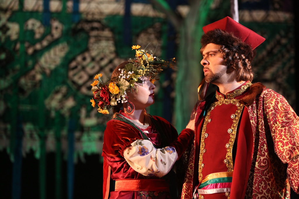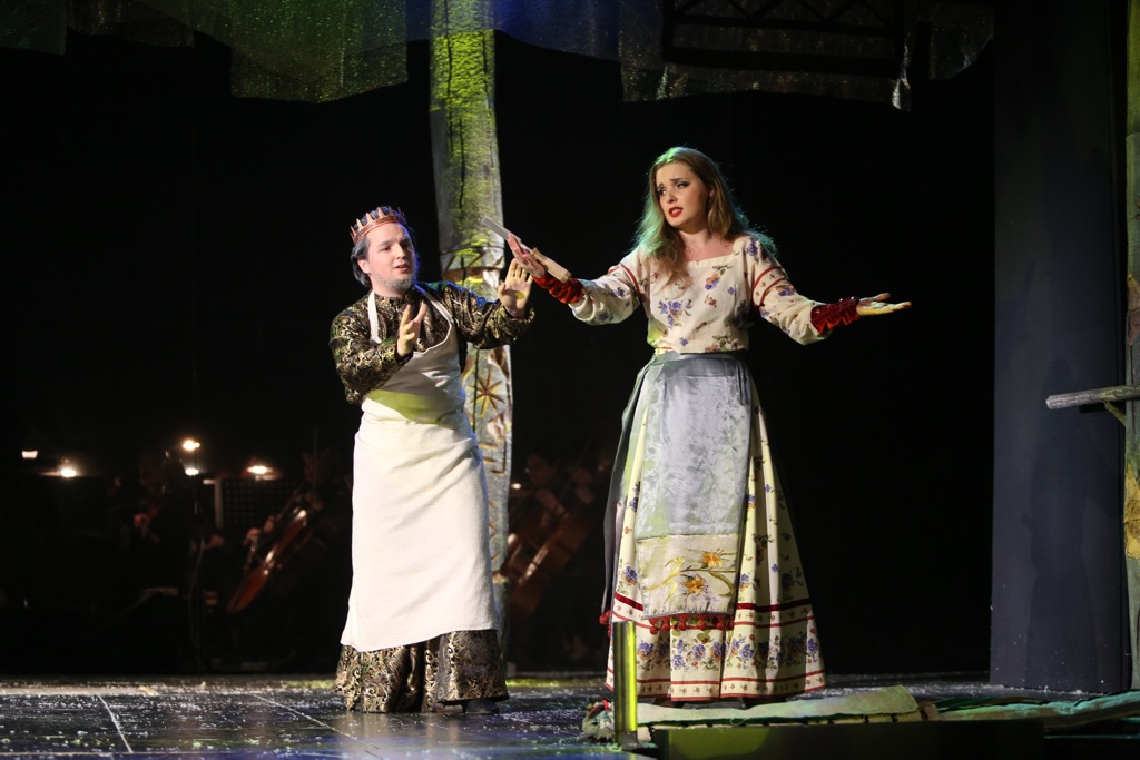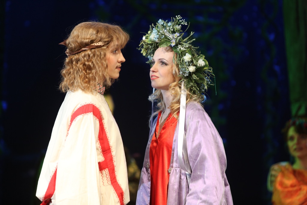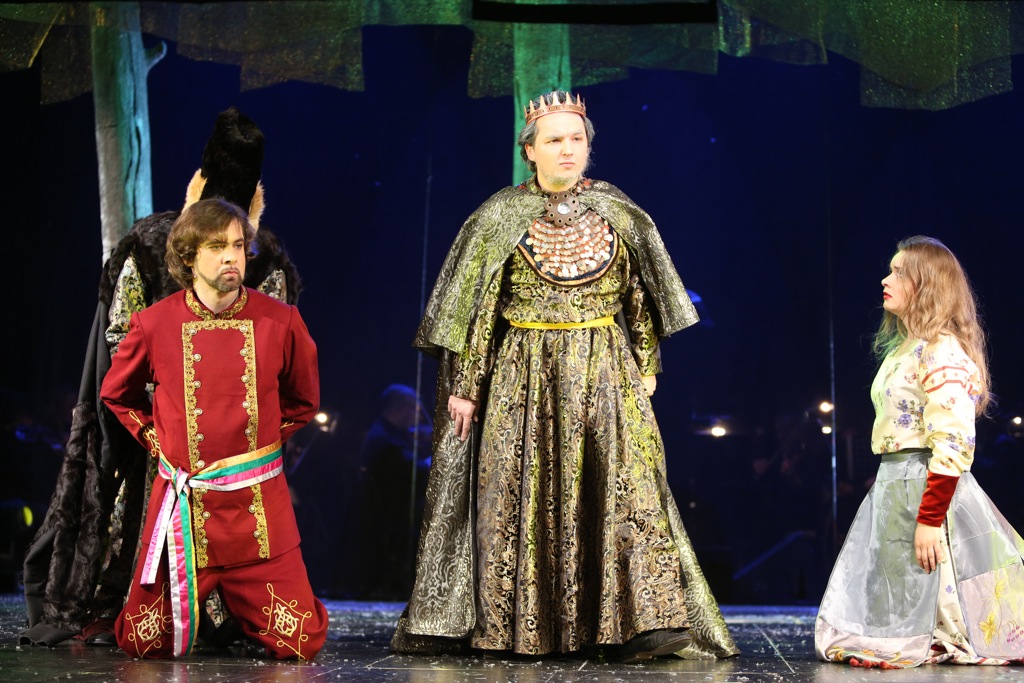 Второй премьерный спектакль, который посетил автор этих строк, был отдан сплошь молодёжи – кто-то уже состоит в штате театра, кто-то ещё только заканчивает курс Петрова в Театральной академии. Как к актёрам к ребятам особых вопросов нет, более того, многие работы очень ярки и убедительны. В отношении вокала не так всё однозначно: голоса есть и по большей части хорошие, но мастерства естественно ещё очень сильно не хватает. Пение в основном на среднем громком нюансе, пиано редки, в верхнем регистре их мало кто умеет делать, а без этого корсаковская лирика многого недобирает. Тем не менее, понравилось серебристое сопрано Ольги Васильевой (Снегурочка), пожалуй, самое мастеровитое из всей молодёжи, звучное и яркое спинто Юлии Борцовой (Купава), мягкий и в целом пластичный тенор Дамира Закирова (Берендей), собранное и красивое меццо Анны Евтушенко (Лель), правда, с недооформленным верхом. Екатерина Курбанова (Весна) уверенно звучала в верхнем регистре, а вот её низ вызывал вопросы и сомнения в меццовой специализации. Несколько засурдинен голос Александра Подмешальского (Мороз), а у Алексея Сазонова (Мизгирь) – настоящие проблемы, ибо столь заваленным, заглублённым звуком петь решительно нельзя, поскольку он не летит в зал и ни единого слова не разобрать. Неплохое впечатление оставили Денис Беганский (Бермята) и Сергей Патракеев (Бакула), хотя по их небольшим партиям полноценное представление о владении голосом составить трудно.