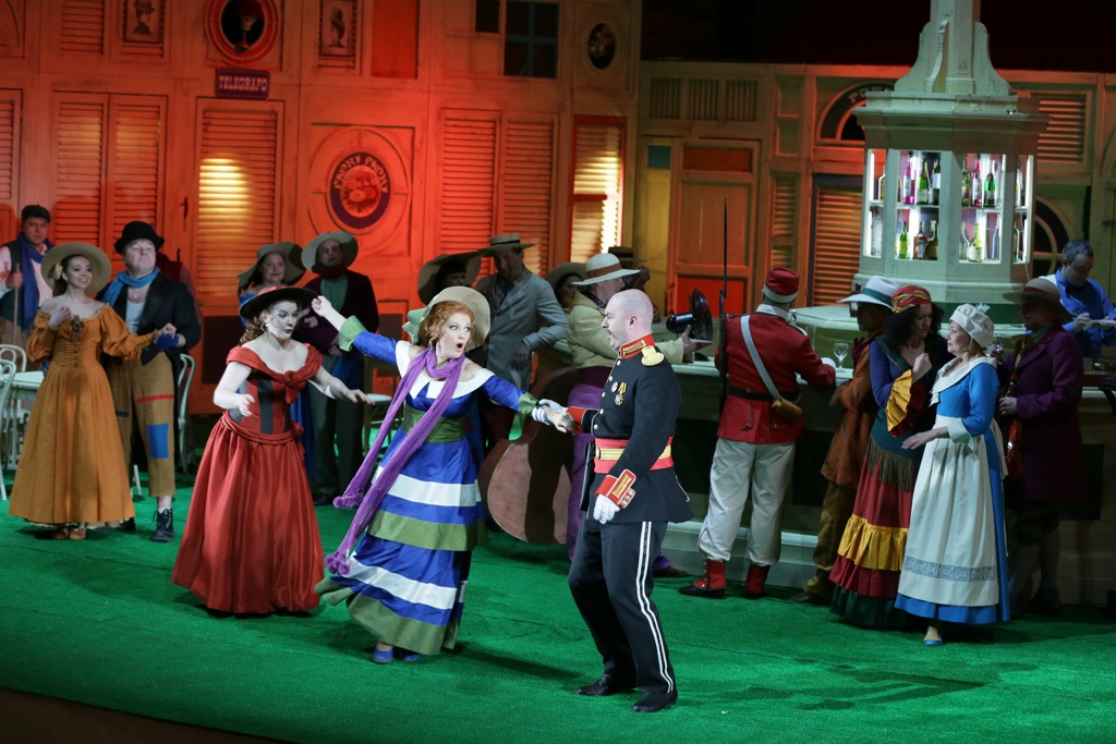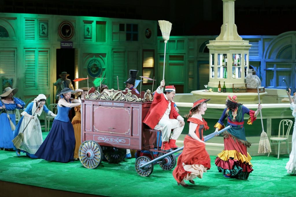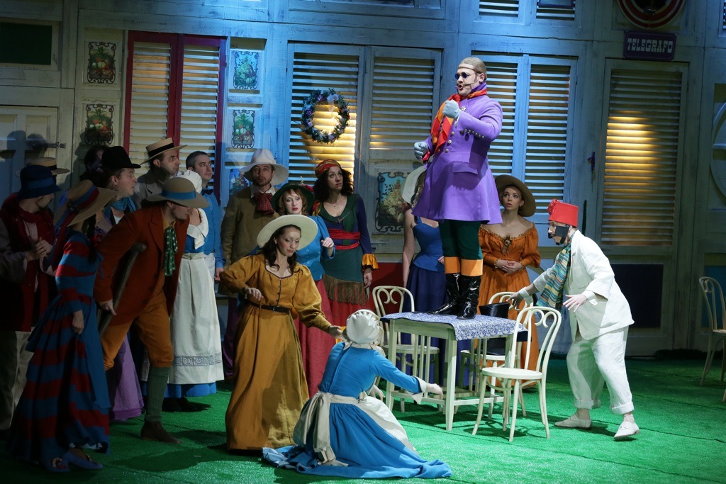 Однако Петров и Фирер — на территории комической оперы, и, разумеется, были далеки от мысли создавать лунные фантазии. Они мыслят «чисто конкретно», их спектакль залит ровным солнечным светом, в котором совсем нет теней, зато есть кричаще яркие краски костюмов, и целлулоидный зеленый лужок. От сочетания болотно-зеленых, синих и белых полос на юбке Адины сводило скулы: немыслимая гамма цветов была приправлена еще и фиолетовым шарфиком на шее. Бравые солдаты сверкали алыми ботами; широкополые шляпки и рискованные декольте деревенских прелестниц воспламеняли воображение. Посреди лужка высилась круглая барная стойка с массивной кассовой машиной и поставцом в центре. Сооружение явно смахивало на фонтан, что обыкновенно стоят на площадях итальянских городков; что заставляло всерьез задуматься о количестве потребляемых пейзанами горячительных напитков.
