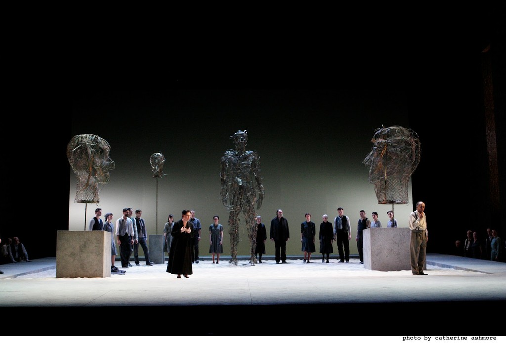 Декорации Алисон Читти представляли собой Стоунхендж, но в огромной, на всю сцену, песочнице. Удивительно, что дизайнеры не подумали о том, что песчаная пыль, поднимаемая многочисленной массовкой, хором, – не самый лучший друг для голосовых упражнений. Периодически шел видеоряд Луки Скарзеллы, вроде бы копирующий декорации и происходящее на сцене, но только все там было убедительнее, чем в сценическое действии.