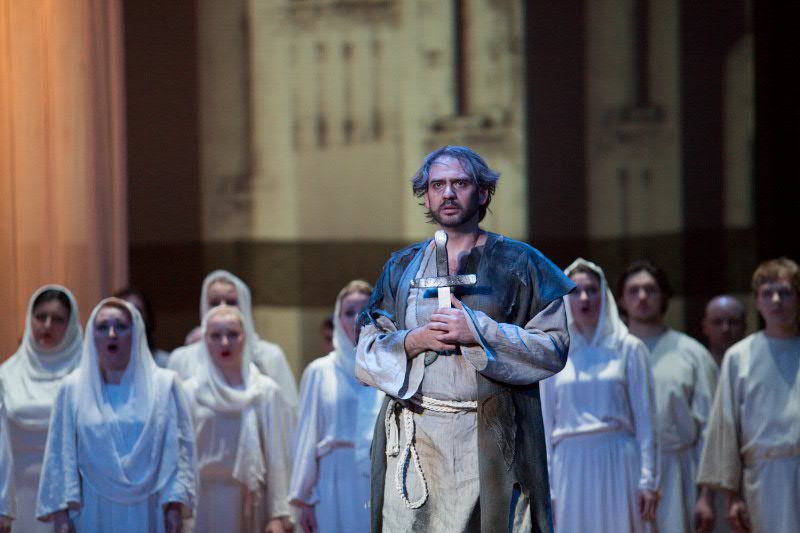 А как вы думаете, получился национальный проект? История Белоруссии – это история не одного народа. Это история немножко Польши, немножко России, немножко Литвы. Великое княжество Литовское, Речь Посполитая, постоянно какие-то пертурбации, то французы пройдут, то немцы. Язык здесь белорусский, национальный. Тема братоубийственной войны тут поднимается, проблема сосуществования католицизма и православия. Все проблемы повести Короткевича тяжело вложить в оперный материал. Тем не менее, спектакль получился ярким, зрелищным, эмоционально очень насыщенным, и занимает сейчас достойное место среди последних премьер нашего театра.
