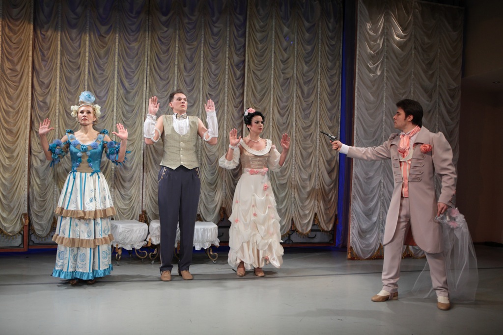 Очаровательная оперная миниатюра Оффенбаха воздушна, подвижна, легко запоминается, но требует исполнительского мастерства. Разнохарактерные музыкальные номера, динамично сменяющие друг друга, ансамбли, речитативы, прозаические диалоги отгоняют от зрителя мысли об антракте и буфете. Артисты театра не подвели композитора, продемонстрировав хороший уровень вокальной подготовки. О композиторе думали не только артисты, но и режиссер спектакля. Музыка стала главной в его решении. У каждого персонажа есть своя музыкальная характеристика, которая помогает режиссеру выстроить образ визуально, пластически и интонационно. Главная героиня спектакля – невеста Сюзон. В разгар свадебного пиршества она находит повод поссорится с новоиспеченным мужем и вскоре оказывается запертой в комнате с неизвестным молодым человеком. Однако одним из первых музыкальных номеров спектакля становится вальс подруги невесты – Розиты. Сопрано заслуженной артистки России Светланы Кольяновой звучит ярко и полетно, помогая создать образ беззаботной кокетливой красавицы, живущей полной жизнью. Именно она и музыкально и сюжетно подстрекает Сюзон к действиям: то слегка флиртует с новоявленным мужем, то настраивает подругу против нежданного гостя. Роль хорошенькой парижанки Сюзон сыграла Мария Селиверстова: она была вспыльчивой и нежной, темпераментной и лиричной, обаятельной и капризной. Следует отметить, что актриса успешно справляется со сложным вокальным партиями. Режиссер предлагает интересную интерпретацию взаимоотношений подруг, тем самым добавив спектаклю психологизма. Две лучшие подружки в то же время являются соперницами. Одна мило кокетничает с чужим мужем, как бы демонстрируя свое превосходство, вторая находит способ отомстить, поставив подругу в безвыходное положение, в результате чего Розита должна выйти замуж за первого встречного.