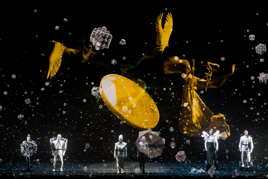 Выглядело это следующим образом. На сцену вышла драматическая актриса (Шарлотта Рамон) с лицом, выкрашенным в зелёный цвет (инопланетянка, не иначе), и на фоне рокочущих в динамиках басов стала зачитывать в микрофон фрагменты из поэмы Мартинсона. Такие литературные вставки то и дело перемежали собой оперное действие.