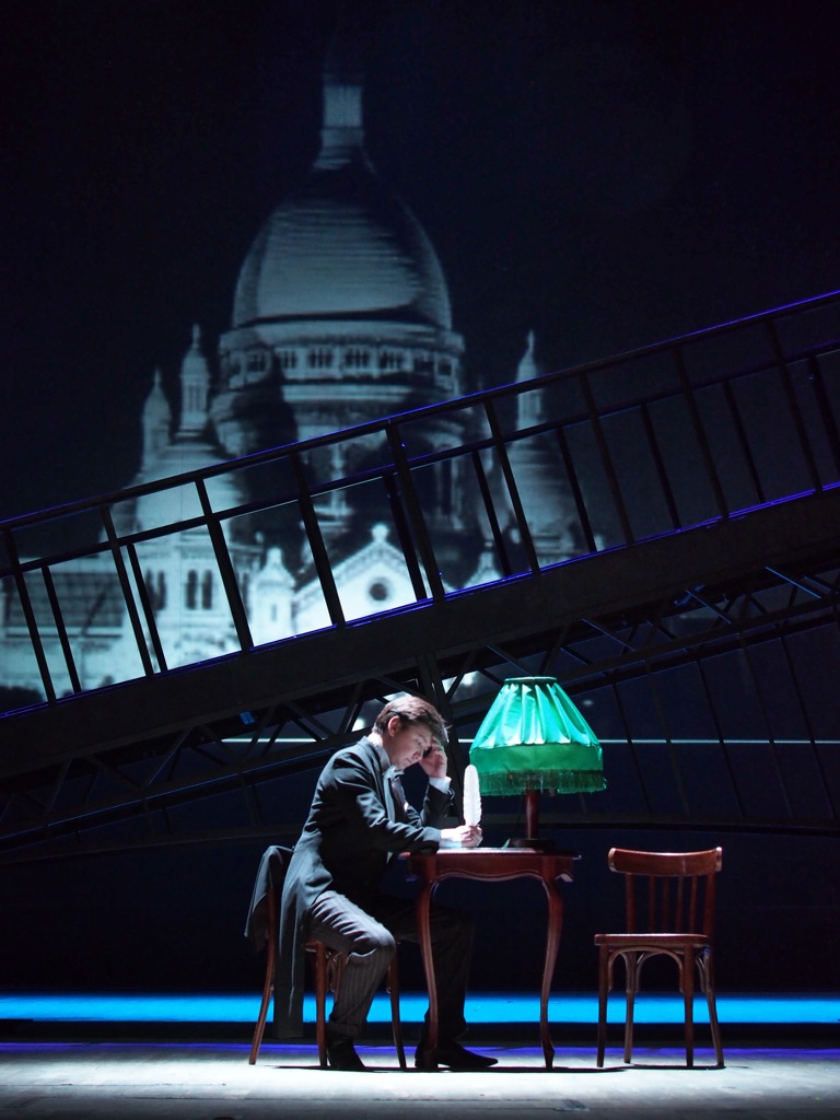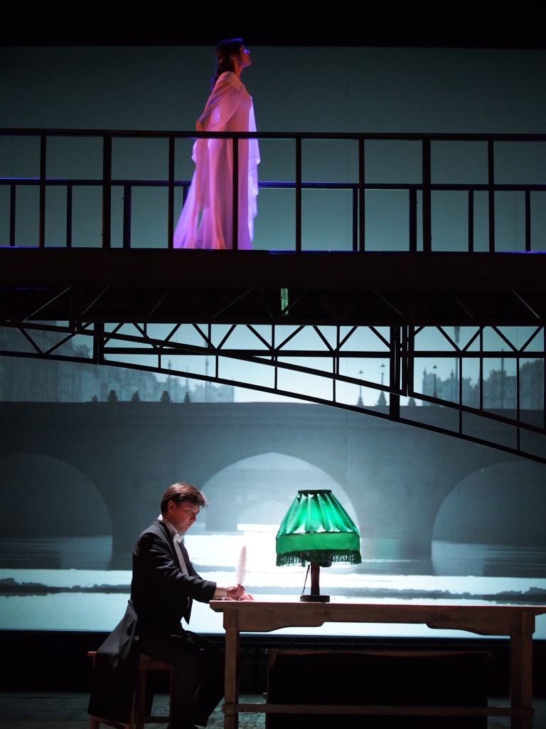Несмотря на философски емкую сценографическую «горизонталь», воссоздающую абстрактно-театральную, но при этом пронзительно точно ощущаемую атмосферу Парижа, поразительно тонко в нее вписывается также интимная «вертикаль»: рассказ ведется как бы от лица Альфреда, предающегося воспоминаниям о прошлом и расставляющего все «четыре вершины» губительного для Виолетты треугольника по своим местам. Этот факт подчеркивают пластические мизансцены первой и четвертой картин. В начале спектакля Альфред сидит за письменным столом, Флора и Жермон кажутся застывшими у противоположных кулис, а по мосту во всем белом проходит видéние Виолетты. Напротив, в последней картине во время финальной арии Виолетты ее пластическими видéниями становятся Альфред, Жермон и Флора, к которым она попеременно обращается: каждый из них сыграл роковую роль в ее судьбе.