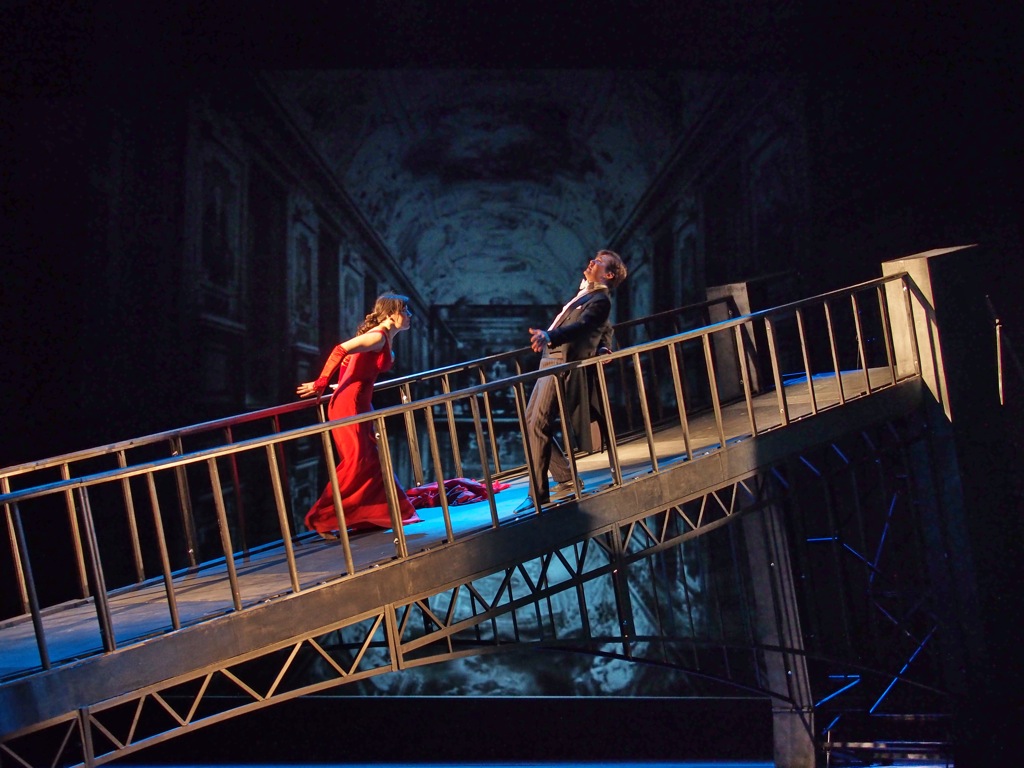 Сама же конструкция моста судьбы в первой половине спектакля остается монолитно застывшей, неподвижной: пружина трагедии лишь только начинается раскручиваться во второй картине с появлением Жермона, разрушающего хрупкую, призрачную идиллию. И мост закономерно рушится в третьей картине, раскрывая опасную сущность своей лишь видимой незыблемости и респектабельности. Покосившийся мост ведет Виолетту в роскошный салон к Флоре – это полунамеком отражает соответствующий задник – и толкает ее к жестоким испытаниям. Мост словно даже показывает свой хищный оскал, немного разворачиваясь к зрителю. В последней картине, когда кульминация страдания души главной героини уже пройдена, а кульминация страдания ее человеческой оболочки еще не наступила, разрушенный мост более не агрессивен, он становится «целомудренно чистым и внутренне светлым», как появляющееся на заднике изображение монмартрской базилики Сакре-Кёр. Но этот мост не может уже привести раскаявшегося Альфреда к Виолетте. В финале оперы герои поют свой прощальный дуэт, но уже далеки друг от друга: их принадлежность разным мирам становится в этот момент наиболее ощутимой.