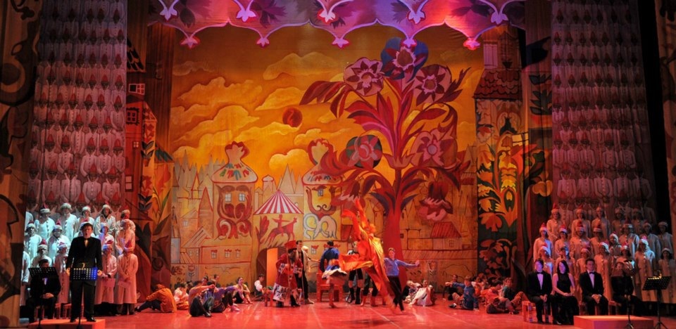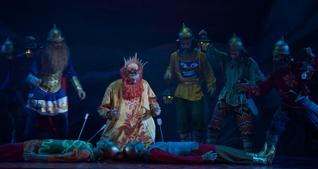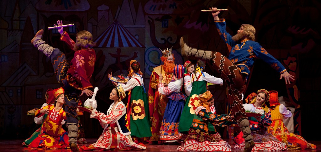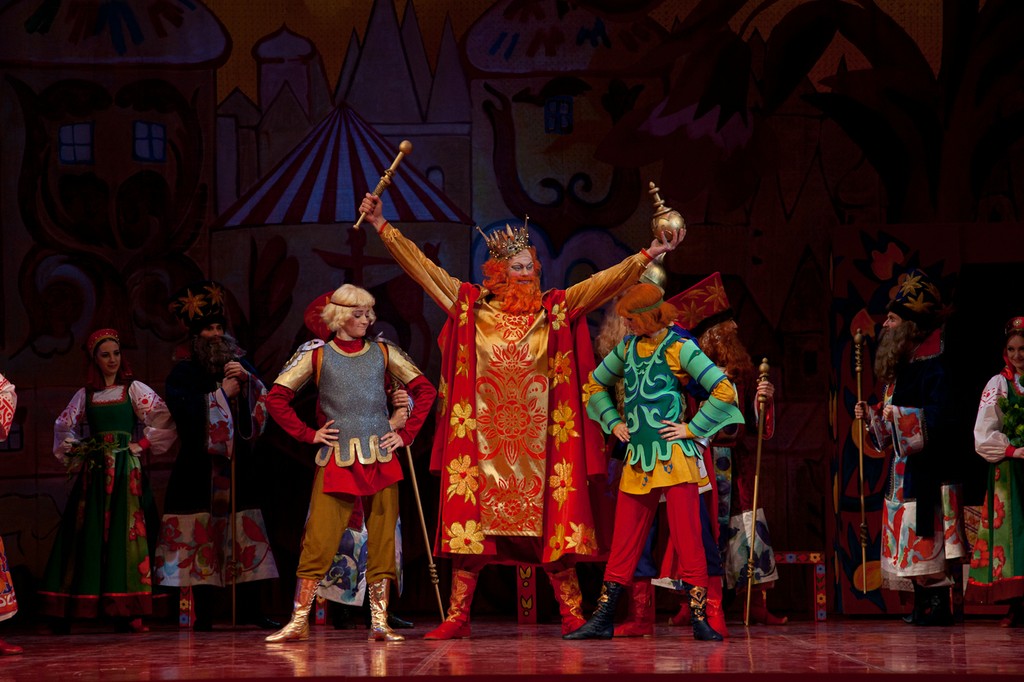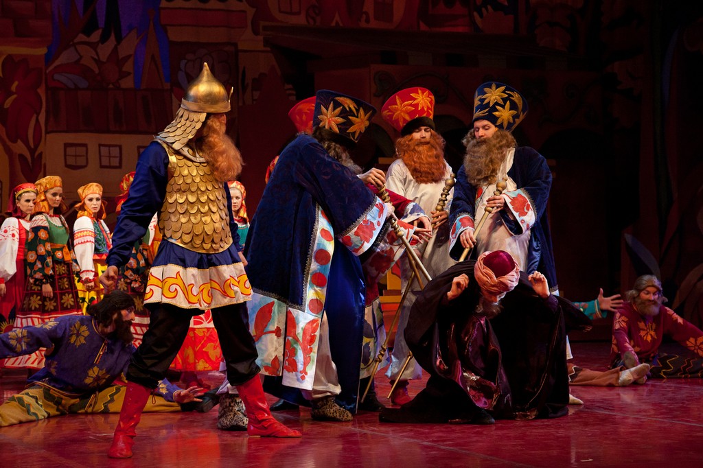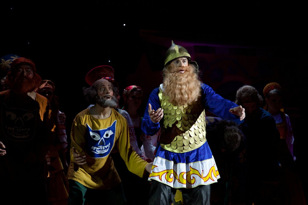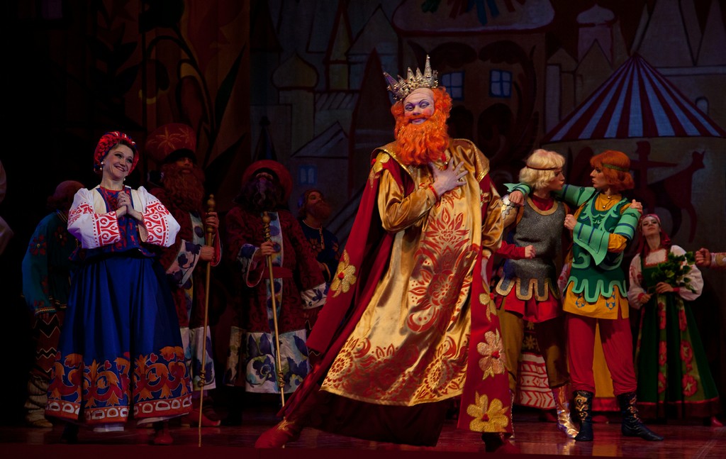 Оказывается, от того спектакля кроме воспоминаний мало, что осталось. Проще всего со сценографией и костюмами: хотя эскизы и разбросаны по музеям и архивам Лондона, Нью-Йорка и Москвы, всё же они существуют, и при кропотливой работе их удалось собрать и активно задействовать при реконструкции. А вот чего не сохранилось совсем, так это записей хореографии Михаила Фокина: фактически Лиепе и его коллеге хореографу Гали Абайдулову пришлось придумывать танцы заново. Разумеется, они опирались на все те материалы, фиксирующие фокинское наследие (краткие кинофрагменты, фотографии, картины, запечатлевшие фокинские балеты), которые всё же имеются, но, честно говоря, этого оказалось так мало, что считать спектакль Театра Сац полноценной реконструкцией никак нельзя. Сценографию Наталии Гончаровой воссоздавал наш прославленный театральный художник Вячеслав Окунев, и это, пожалуй, самая сильная сторона нынешнего спектакля. Аляповатые, в эстетике лубка декорации, воссоздающие царские палаты Додона в натуральную величину в первом и третьем актах, романтическая луна на заднике над волшебным образом возникающим ниоткуда изящным шатром Шемаханки во втором, - всё это даёт спектаклю яркий визуальный образ, образ настоящей сказки, столь уместный прежде всего в детском театре. Необыкновенно хороши костюмы, выдержанные в том же ключе: пёстрые, разнопёрые, кричащих цветов, они смотрятся убедительно – словно сошедшие с картинок старой книги сказок, той самой, что вы читали в детстве. Для Шемаханской же царицы и её танцующих подруг-прислужниц с длиннющими и чёрными как ночь «косами-змеями» художник находит нежное романтическое решение: здесь уже не гротеск и насмешка, не разряженные петрушки крайних актов, но высокий эстетизм, настоящее служение красоте, пусть даже и красоте, за прекрасной формой скрывающей зло. Впрочем, кто есть отрицательный, а кто положительный персонаж в «Золотом петушке» Пушкина – Римского-Корсакова судить весьма непросто, и менее всего с такой чёрно-белой оценочной шкалой следует подходить к Шемаханке – персонажу загадочному и многозначному.