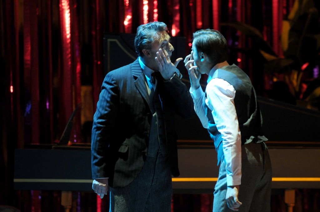 Когда занавес наконец поднялся, опасения только усилились. Фламан и Оливье, обмениваясь колкими репликами, копировали движения друг друга, как будто бы один был отражением другого в зеркале. Прямолинейно до плоскости, а кроме того, старо как мир. В сущности, это не что иное как одно из тех упражнений, с которых обычно начинают своё обучение студенты-актёры на первом курсе. Будучи сам преподавателем актёрского мастерства, я мысленно поставил певцам за это упражнение тройку с минусом.
