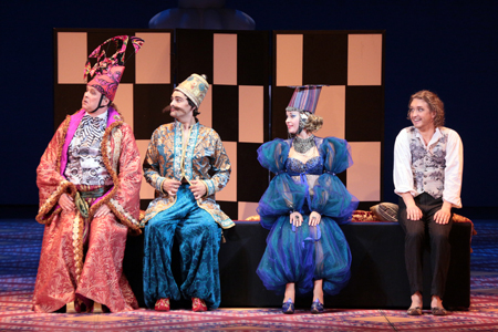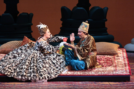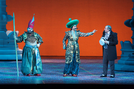 Пред нами игра, причем восточного происхождения – шахматы. Все происходящее на сцене ассоциируется с шахматной партией, имеющей свою стратегию-интригу. Это подчеркивается лаконичным сценографическим решением художника-постановщика Зиновия Марголина – на сцене представлены гигантские фантазийного характера шахматные фигуры белого и зеленого цвета (символ ислама?), напоминающие короля, ладью, коня, пешку и т. д., а сценический занавес исполнен в виде черно-белой шахматной доски. Фигуры эти со всей очевидностью символизируют персонажей оперы, передвигаясь по сцене в зависимости от обстоятельств как самостоятельно, так и влекомые участниками спектакля. По ходу действия они иногда модифицируются, выполняя роль реквизита (ванну, где нежится Мустафа, или корабль для побега итальянцев из плена. Шахматный мотив – и так вполне явный – Писарев с Марголиным не боятся еще раз подчеркнуть при помощи стоящего в углу шахматного столика с маленькими фигурками. Постановщики словно напоминают нам: да не ищите вы ничего лишнего и иносказательного, все прозрачно! И… условно – никакого тебе дворца с его роскошными покоями, берега моря, корабля – всего того, что обозначено в ремарках композитора. Вся же необходимая оперная восточная роскошь (без нее не обойтись!) сосредоточена в ярких пестрых костюмах (Виктория Севрюкова), скроенных с разумной мерой обобщенной образности, не посягающей на точную этнографичность.