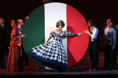 Трудно представить себе что-либо подобное в отношении «Итальянки», где доминирует чистая буффоннада, а патриотическое звучание знаменитого Рондо Изабеллы Pensa alla patria часто склонны преувеличивать. Поэтому всяческие попытки обнаружить в этой комедии положений дополнительные скрытые аллюзии равнозначны «поискам черной кошки» там, где ее нет! В связи с этим чрезвычайно усложняется задача режиссера – ему не за что зацепиться, чтобы явить нам буйство своей безудержной фантазии, призванной скрыть за парадоксами и ребусами новых смыслов и метафор отсутствие музыкального мышления, а также нежелание (или неумение) искать иные выразительные средства. Конечно, тщательно актёрски прорабатывать мизансцены следуя музыкальному темпоритму труднее, нежели загромождать действие двусмысленными, а, значит, ни к чему не обязывающими постмодернистскими «штучками».