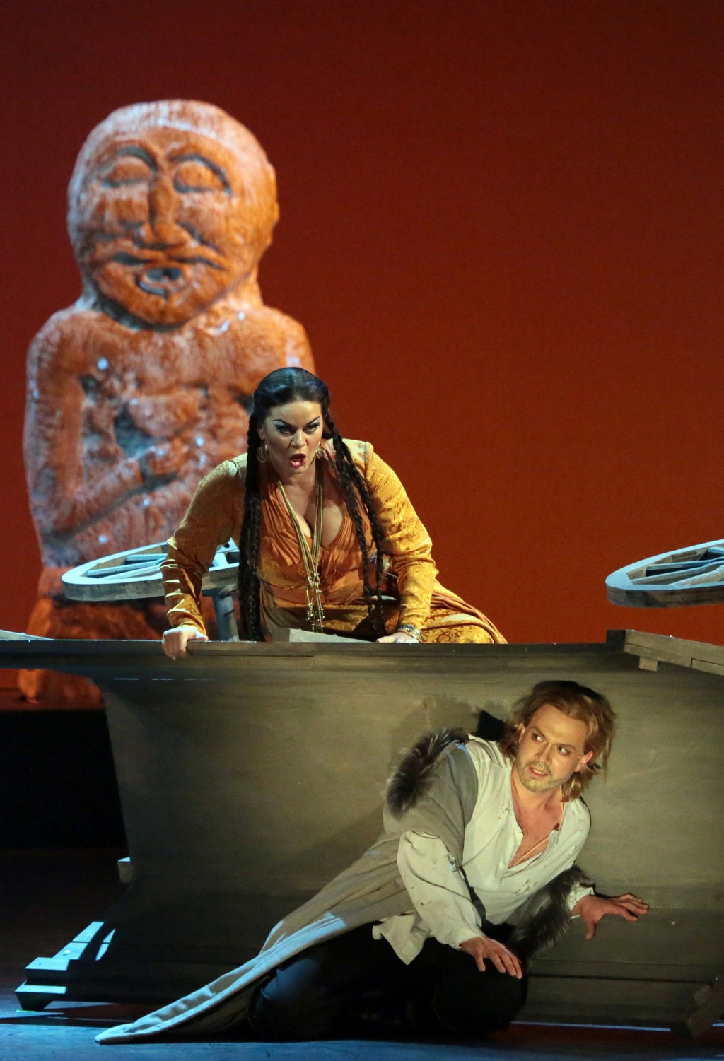 Далее в половецкой картине, которая в этой редакции опережает сцену у Галицкого, Владимир Игоревич прячется под перевернутой телегой и оттуда поёт: «Где ты где, отзовись!» Согласитесь, искать и звать кого-то на любовное свидание, спрятавшись самому под телегой, - странная стратегия. Но когда зритель видит эротические приседания Кончаковны на раздвинутых ногах во время знаменитой арии, он может, в некотором роде, даже и посочувствовать княжичу: такая темпераментная девушка кого угодно под телегу загонит.