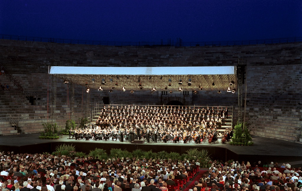 Понятно, что, когда речь идет об Арена ди Верона, без «Вердибесия» не обойтись (на итальянский язык «Вердибесие» непереводимо, и поэтому автор использует гораздо более «спокойное» слово «Verdimania»; оно будет стоять в заголовке каждого отчета о веронских празднествах). Поначалу хотели сыграть что-то из Вагнера, да быстренько от этого отказались: публика была бы малочисленной. Так что афиша нынешнего фестиваля - «Вердибесие» в полном смысле этого слова, на ней представлены традиционный бренд Арены «Аида» (аж в двух сценических версиях), «Набукко», «Травиата», «Риголетто», «Трубадур». Не обходится без специальных событий, Гала Верди и Реквиема, двух гала-концертов с участием Пласидо Доминго. Исключение составляет лишь «Ромео и Джульетта» Гуно (поклон в сторону родного города несчастных шекспировских любовников).