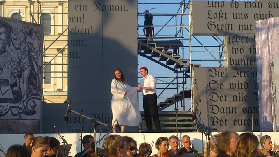 Между добром и злом помещён Фауст. Он и раздраженный, отчаявшийся старец вначале, и радостно ощутивший силу в теле вожделеющий молодой мужчина, и человек, способный на романтические чувства. А дальше - циник, подыгрывающий пошлостям мелкого беса и трус, убивающий в спину. В общем, хрестоматийная история распада личности, обозначенная наглядно и четко, как это и свойственно площадному театру. Артем Коротков, солист веймарской оперы, в прошлом воспитанник С-Петербургской консерватории, неплохо справился с верхним фаустовым «до» и показал актерскую зрелость, с благоприобретенной немецкой точностью наполнив содержанием непростой рисунок роли. Но главным героем, все же, не стал.