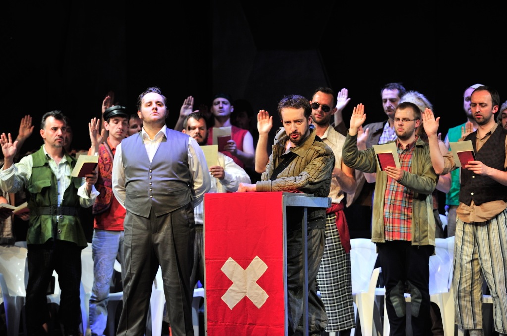 Эти слова и впрямь не расходятся с делом. Несмотря на минимализм театральной «меблировки» и наивную иллюстративность сценографии, а также весь гардероб спектакля, кажущийся востребованным из театральной подборки, оставшейся от самых смелых радикальных постановок XX века, общий визуальный ряд обсуждаемого «Вильгельма Телля» проникнут несомненно мощным психологическим драйвом и чрезвычайно силен по своему эмоциональному воздействию. Мизансцены, пластика и хореографическая составляющая спектакля, вместе взятые, хотя и выглядят достаточно брутальными, вполне реалистичны, правдивы и, самое главное, не выходят за границы здравого смысла, рассказывая именно тот сюжет и донося до слушателя именно ту музыкальную историю, которая изначально была заложена в партитуре. В обстановке импровизированного театра-павильона, в условиях «спектакля на водах», происходящее на сцене – вневременнóе по своей сути и местами всё же несколько эпатажное – оказывает на зрителя явно отрезвляющее, я бы сказал, терапевтическое воздействие.