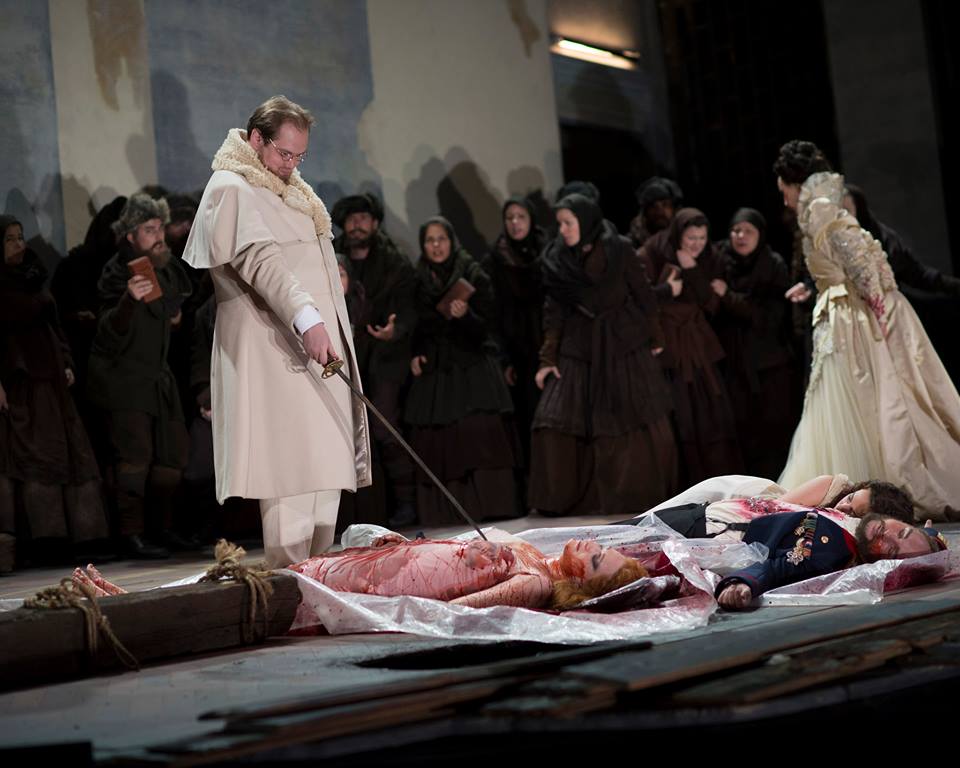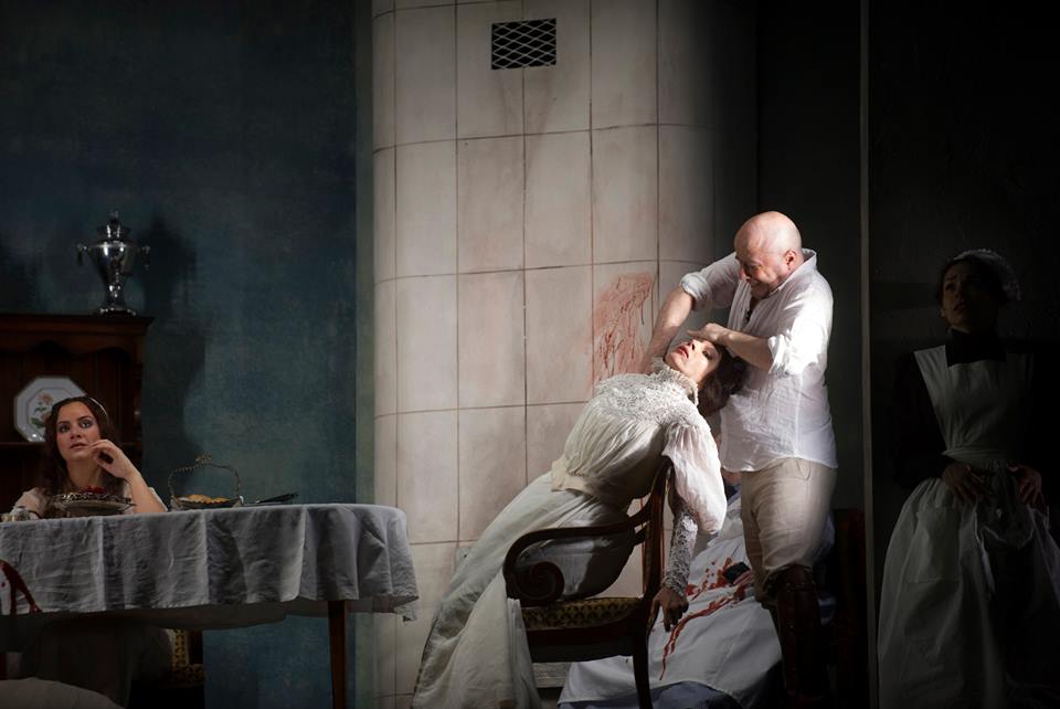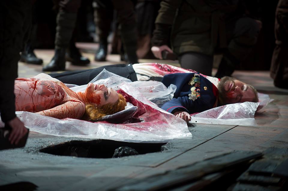 Совсем не так в концепции режиссера Таддеуша Страссбергера. Опера визуально переносится в современную Танееву эпоху, она поставлена в обветшалых декорациях, которые были созданы по образцу настоящего санкт-петербургского дворца, с чердачными драпировками, русскими военными регалиями и монашескими одеяниями. Кровь прольётся рано, когда Клитемнестра (Любовь Соколова) перережет горло барану, дабы принести жертву богам. Эгист (Андрей Борисенко), её любовник, хотя и убьёт Агамемнона (Максим Кузьмин-Караваев) и троянскую принцессу Кассандру (Мария Литке) за сценой, но их окровавленные тела будут видны на пластиковом экране. Орест (Михаил Векуа), сын Агамемнона, убивает Эгиста непосредственно на полутемной сцене, которая быстро освещается кроваво-красным светом.