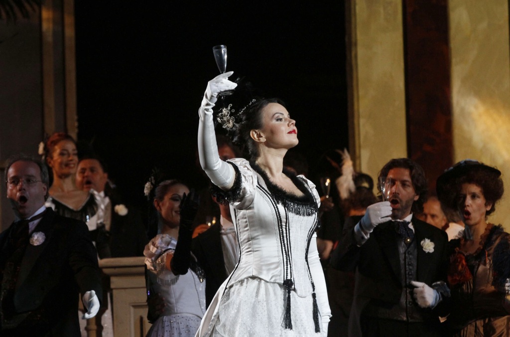 В первом акте «Травиаты» слушатель мог вздохнуть спокойно, да и попросту «оттянуться», слушая пение Франческо Мели – Альфреда. Генуэзский тенор, как всегда был на высоте, подкупив красотою тембра, звонкостью, мягкостью звукоизвлечения и тончайшей фразировкой. Вредит Мели только одно, но весьма немаловажное качество – отсутствие яркой актерской индивидуальности. Рядом с ним меркла Виолетта в исполнении польской певицы Александры Курзак: почти все ноты были на месте, включая сверхвысокий ми-бемоль (хотя певицу можно было упрекнуть в погрешностях в интонации), но персонаж, столь изумительно выписанный Верди, «красивый какой-то особой прозрачной красотой», по выражению Густаво Маркези, никак не вытанцовывался. Артистка оказалась неспособной проникнуть в суть изображаемого персонажа. Нет в Александре Курзак и неотразимой женственности, утонченности чувств, она откровенно простовата. La classe non è acqua, и юная провинциалка Альфонсин Плесси, ставшая одной из самых известных и элегантных женщин Парижа, которую обессмертил сначала Александр Дюма-сын в романе, а затем Верди в опере, уж точно не напоминала продавщицу.