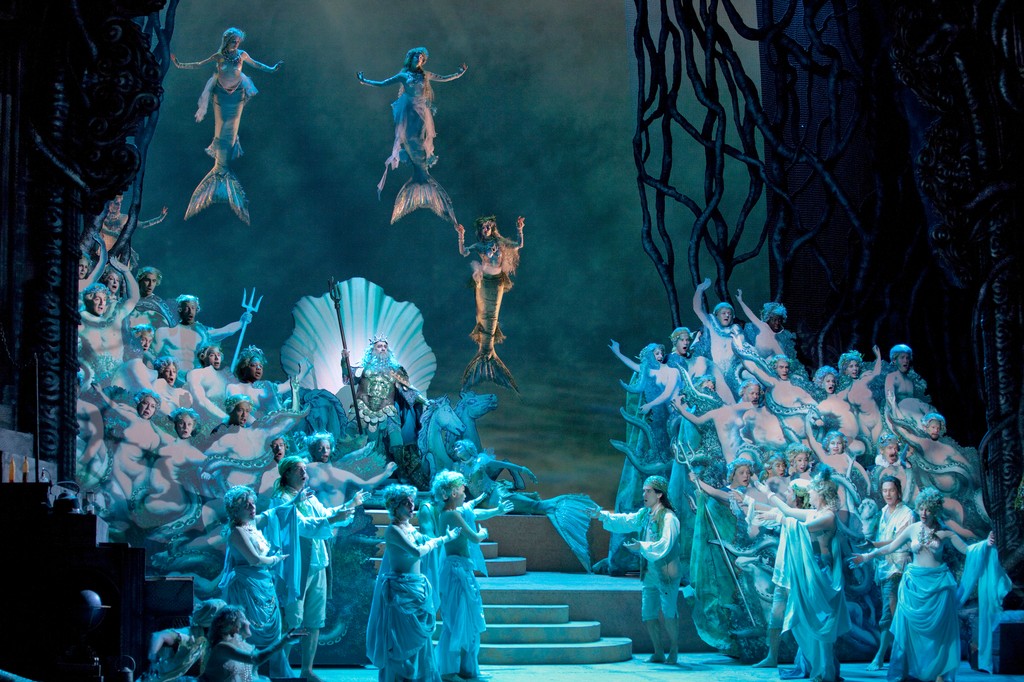 31 декабря 2011 года в Метрополитен-опере состоялась мировая премьера спектакля “Очарованный остров” – барочной англоязычной композиции Джереми Сэмса (я упоминал его, как постановщика “Летучей мыши”) и Уильяма Кристи на сюжет пьес В.Шекспира “Сон в летнюю ночь” и “Буря”. В композиции соединены арии и ансамбли Г.Ф.Генделя, А.Вивальди, Ж.-Ф.Рамо, а также других, менее известных композиторов той безоблачной эпохи. Режиссеры Фелим Макдермотт и Джулиан Кроч придумали увлекательный оперный дивертисмент XVIII века в современных декорациях. В новом сезоне опера возвращается в репертуар театра. Состав почти не изменился: те же Дэвид Дэниелс (Просперо), Даниэлла Де Низе (Ариэль), Пласидо Доминго (Нептун), Лука Пизарони (Калибан). Первую исполнительницу партии ведьмы Сикоры Джойс Ди Донато заменит Сьюзан Грэм, в партии Миранды на сцене МЕТ дебютирует певица из канадского Виннипега Андриана Чукман. Дирижер – музыкальный руководитель Хьюстонской оперы Патрик Саммерс.