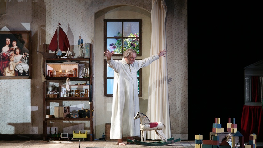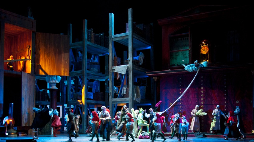 Штефан Херхайм – как профессионал высшей пробы – не умеет ставить плохо. Однако статика, которой изобилуют мизансцены новой постановки, практически погребла под собой намеченную, но слабо реализованную идею сублимативности источника любого творчества. И сонм героев Братьев Гримм, и тем более эротические вольности в сцене «народных волнений» лишь усугубили ситуацию: идея не считалась. А замысел был прекрасен. Главным героем спектакля Херхайм делает Сакса. Отправная точка – личная потеря майстерзингера. Опустевший дом, в котором появляются призраки как плод творческого воображения, расслаивается на элементы вырастающие в гипертрофированные интерьеры: конторка превращается в храм, рабочие полки – в многоэтажные постройки, а буфет – в жилой дом (сценограф Хайке Шееле). Но по факту именно сценография стала наиболее живым элементом спектакля, тогда как совершенно грандиозная, на мой взгляд, идея амбивалентной взаимозависимости Закса и Бекмессера как двойников и как двух сторон одного собирательного образа, так и осталась недовыделанной, вынесенной за рамки спектакля – на авансцену перед остальными поклонами. Словом, как-то не сложилось. И от этого осталось чувство обделенности.