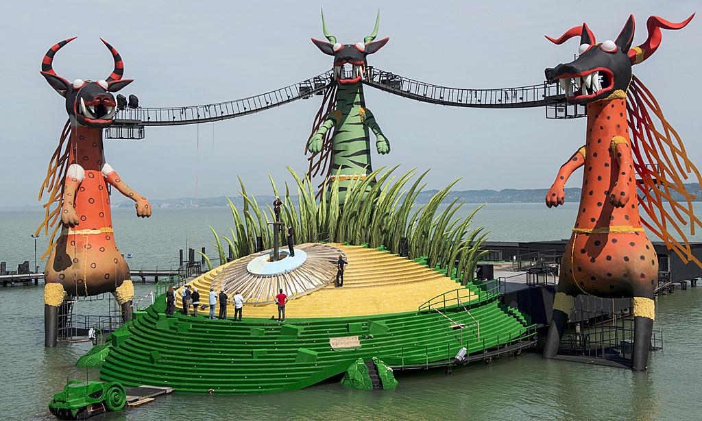 Разговор о музыке придется оставить на потом, так как хорошо известно: спектакли на озерной сцене призваны не сколько услаждать уши, сколько поражать воображение. Этой цели удалось достигнуть и на этот раз, снова публике пришлось открывать рот и ахать. Описать всё, что «нагородил» на сцене «тройственный союз» в лице сценографа Йохана Энгельса, автора костюмов и гигантских кукол Мари-Жанн Лекка и режиссера Дэвида Паунтни, совершенно невозможно, понадобился бы объем, близкий к роману!