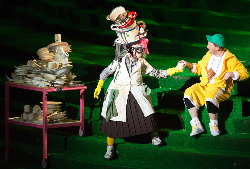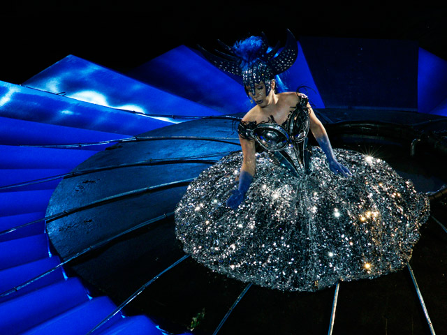 Отдельные костюмы совершенно поразительны. Впереди, конечно, Царица Ночи, на то она и царица! Одетая в жесткий, обрисовывающий формы корсаж, переливающуюся серебром длинную широкую юбку, головной убор темно- синего цвета, в середине – помпон, по богам – нечто вроде рогов, и темно-синие перчатки, она помещена на огромный круг темно-синего же цвета. Во время ее арий певица начинает отрываться от земли и медленно взмывать вверх, напоминая о птице, сидящей на шесте. Кажется, что ее феерические и истерические колоратуры доносятся прямо из звездной бездны... А что сказать о премилой Папагене, которая является своему суженому в виде старухи-посудомойки, одетой в белый халат и желтые резиновые перчатки, с пирамидой из грязных чашек, которая каким-то чудом удерживается у нее на голове?