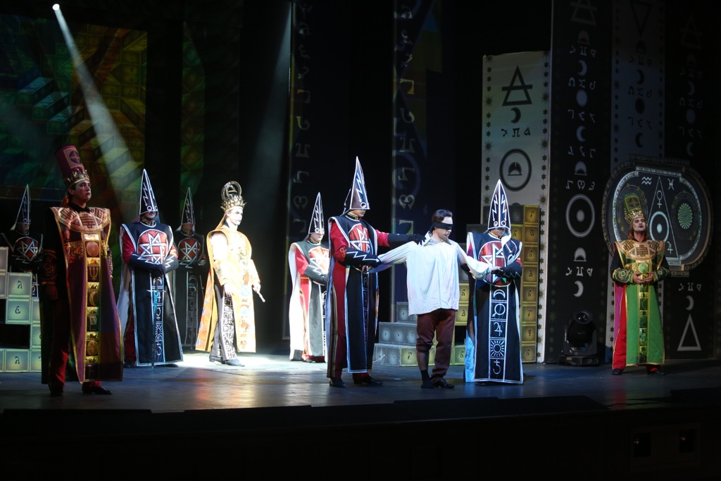 Чтобы восприятие происходящего на зацикливалось на поиске глубокомысленных подтекстов и мудрствований, представление приобрело еще и яркую игровую форму, во многом благодаря цирковому антуражу. Прием, надо сказать, не новый в сценической истории «Флейты». Еще Марк Шагал, известный своей приверженностью к мотивам цирковых «полетов во сне и наяву», всякого рода циркачам и акробатам, заигрывал с «Флейтой» подобным образом в своих декорациях к метрополитеновской постановке 1967 года. Перед глазами еще более наглядный классический пример – спектакль Ахима Фрайера 1997 года на Зальцбургском фестивале.