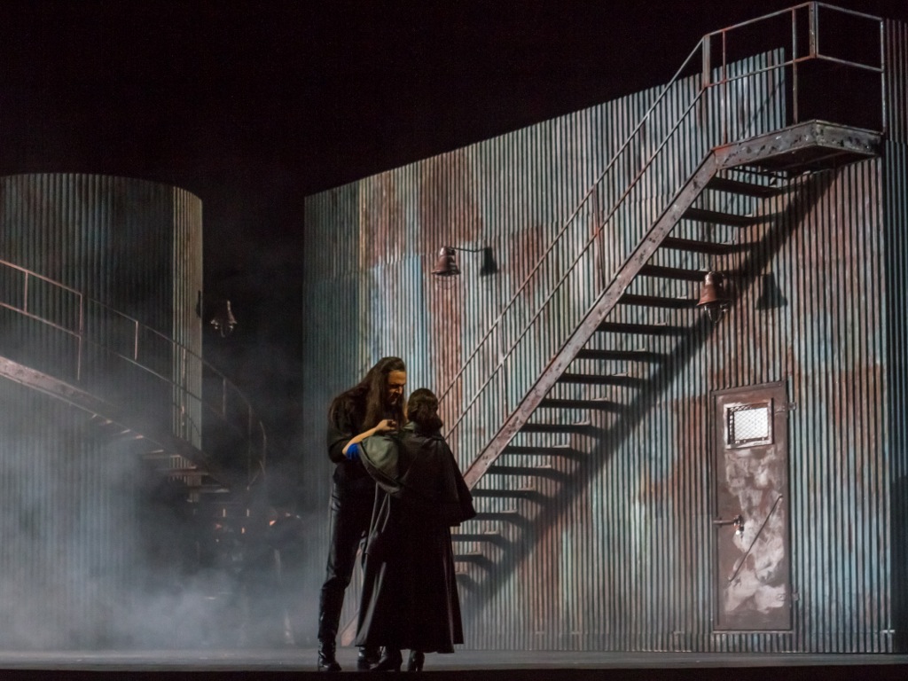 Мир этого «Голландца» - сумрачен и суров (сценограф Гэри Маккенн), как, впрочем, и сама музыка композитора в этой опере, бушующая, словно морская стихия. Раскрывается впервые занавес и на сцене виден высокий жестяной короб, рифлёные грани которого резки и строги: это пресловутый корабль – символ всей оперы, рождённой впечатлениями от бурного плавания композитора по северным, неуютным и негостеприимным морям. Потом появится такой же второй, словно копия, словно зеркальное отражение – корабль-призрак моряка-скитальца; это же рифлёное железо, развернувшись во всю сцену и выстроившись углом, во второй картине образует «индустриальную» картину швейного производства, где работают девушки – подруги романтической Сенты. Благодаря такому решению пространство мира Сенты – тесно, душно и несвободно, становится сразу понятно, что героине здесь плохо: замкнутое минималистичное бытие раскроется только дважды, показав красивейшую и манящую морскую перспективу – при первом появлении Голландца – рыцаря-мечты перед впечатлительной девушкой, и в трагическом финале, навеки соединяющим верную возлюбленную и её избранника. Огромна роль в этих простых, но впечатляющих своей грандиозной красотой решениях световой партитуры (художник по свету – Евгений Виноградов).