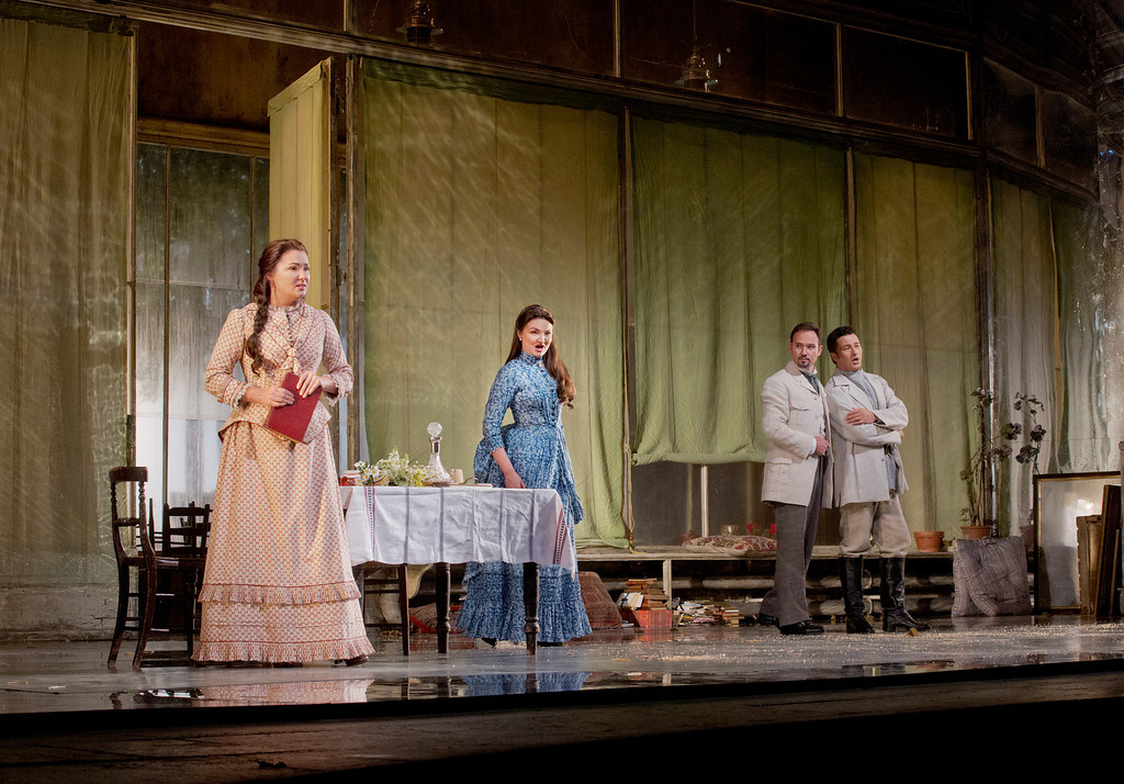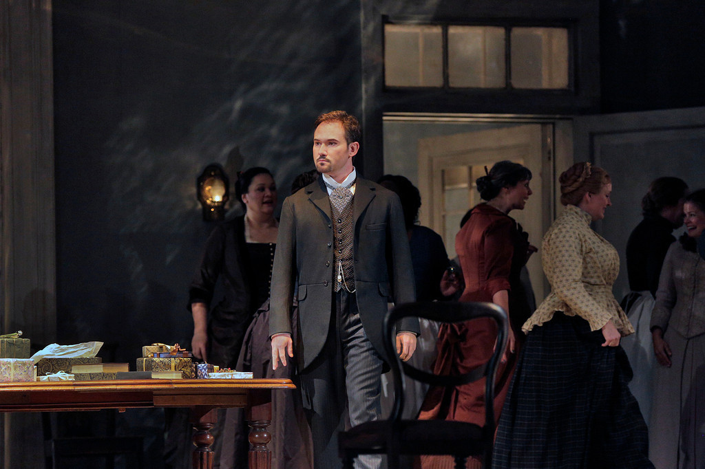 В отличие от Нетребко никаких вопросов не вызывают прочие женские персонажи оперы. Великолепна Ольга в исполнении белоруской певицы Оксаны Волковой – может быть ей несколько недостаёт контральтовой роскоши а ля Тамара Синявская, но партия сделана очень музыкально и аккуратно, а образ юной шалуньи у артистки получился вполне законченным. Выше всяких похвал маститая Лариса Дядькова в партии Няни – пение не только профессиональное, но какое-то искреннее, сердечное, задушевное, отчего образ получается исключительно достоверным и привлекательным: пожалуй, всякий, кто слушает и смотрит на эту работу певицы, невольно вспоминает своё счастливое детство и любимую бабушку. Хороша и Елена Заремба в партии Лариной-старшей – красивое, стильное лицо, высокий рост и аристократические повадки делают помещицу несколько более европейской, нежели традиционно принято у нас, но в концепцию Уорнер это вписывается органично, кроме того, звучит Заремба по-прежнему восхитительно, её густое меццо переливается всеми возможными красками. Кстати, в этот раз обе второстепенные женские партии отданы низким голосам – любопытно и необычно было слушать дуэт двух контральто в первой картине оперы.